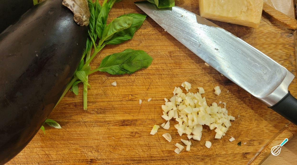 Comece fazendo o molho de tomate. O primeiro passo é picar os dentes de alho.