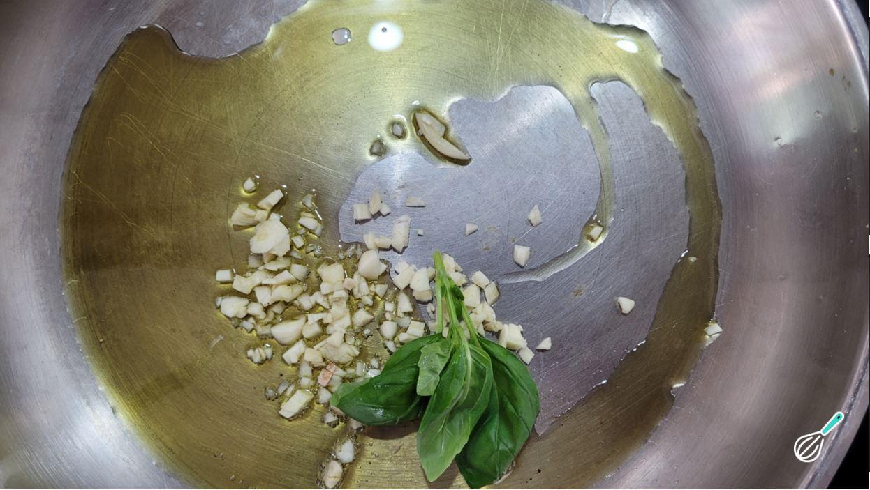 Em uma frigideira, coloque um pouco de azeite, os dentes de alho picados e umas folhinhas de manjericão.