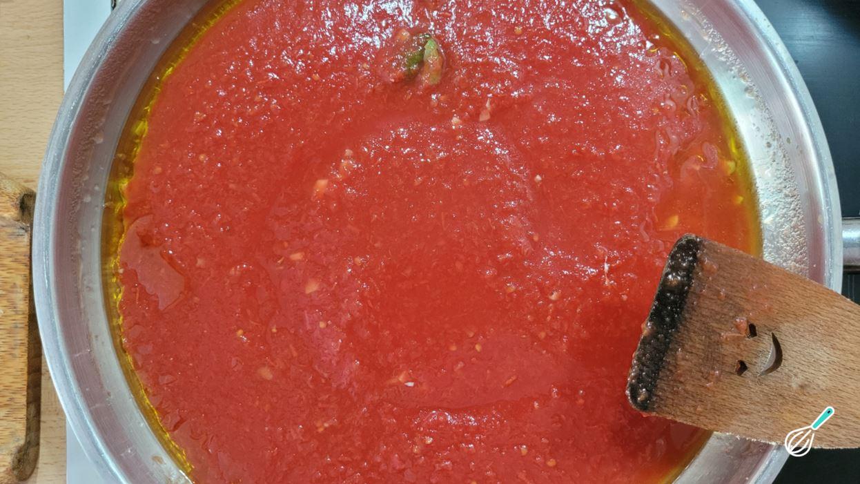 Quando o alho começar a perfumar, abaixe o fogo e adicione a passata de tomate, colocando um pouquinho de água se necessário, caso esteja muito espesso.
