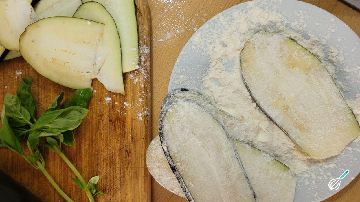 Empanar as berinjelas faz com que fiquem mais douradinhas. A ideia é fazer uma camada bem fina de farinha. Por isso, passe cada fatia na farinha e bata para retirar o excesso e ficar apenas o que grudou na berinjela.