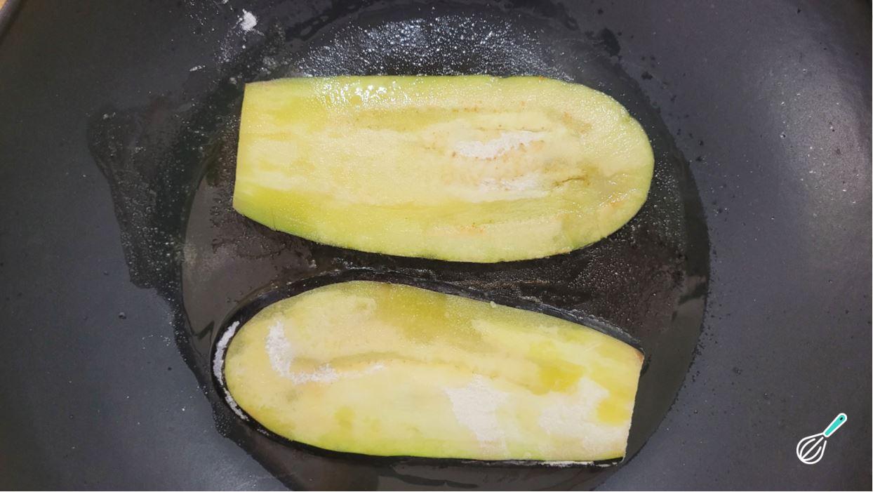 Comece a dourar as berinjelas em uma frigideira com azeite. De preferência, use uma frigideira antiaderente para facilitar e precisar colocar menos azeite. Deixe dourar dos dois lados.