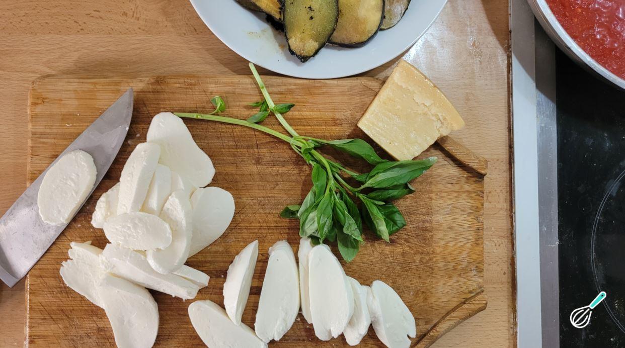 Quando todas as berinjelas estiverem douradas, podemos começar a montagem. Corte a muçarela em fatias.