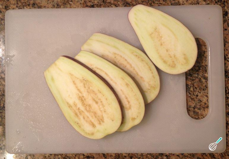 O primeiro passo para preparar sua lasanha de berinjela simples é lavar bem as berinjelas, cortar as pontas e cortá-las em fatias, no sentido do comprimento.