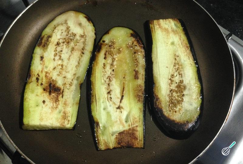É necessário pré-cozinhar as berinjelas para não ficarem borrachudas e com gosto ruim, por isso tempere-as com sal e pimenta e grelhe-as ligeiramente de cada lado. Como alternativa pode cozinhá-las em água com sal por 3 minutos. Reserve.
