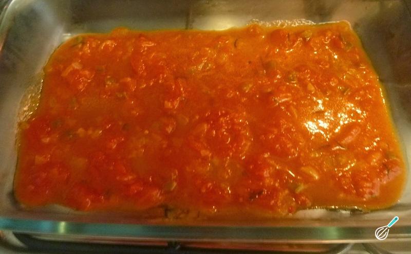 O passo seguinte é fazer a montagem da lasanha de berinjela simples. No fundo de um refratário espalhe um pouco de molho e, sobre ele, disponha 3 a 4 fatias de berinjela, o suficiente para formar uma camada.