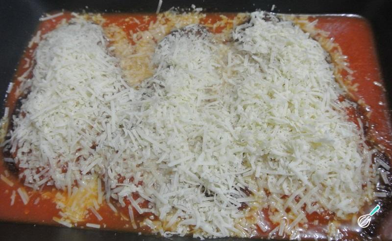 Sobre as berinjela coloque algumas fatias de mussarela e repita a montagem até esgotar todos os ingredientes. No final polvilhe com o queijo parmesão e leve a assar no forno no forno preaquecido a 180ºC durante 20 a 30 minutos.