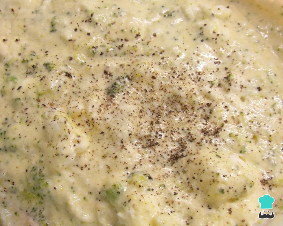 Desligue o fogo da panela do brócolis e tempere a gosto com sal e pimenta. Coloque o requeijão e misture tudo, para conseguir um recheio de brócolis cremoso para esta lasanha bolonhesa com brócolis.