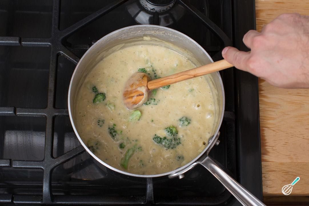 Adicione o refogado de brócolis e o creme de leite ao molho branco e misture tudo. Se achar necessário acerte o sabor com mais sal e pimenta pois esse é o recheio da sua lasanha de brócolis com queijo!