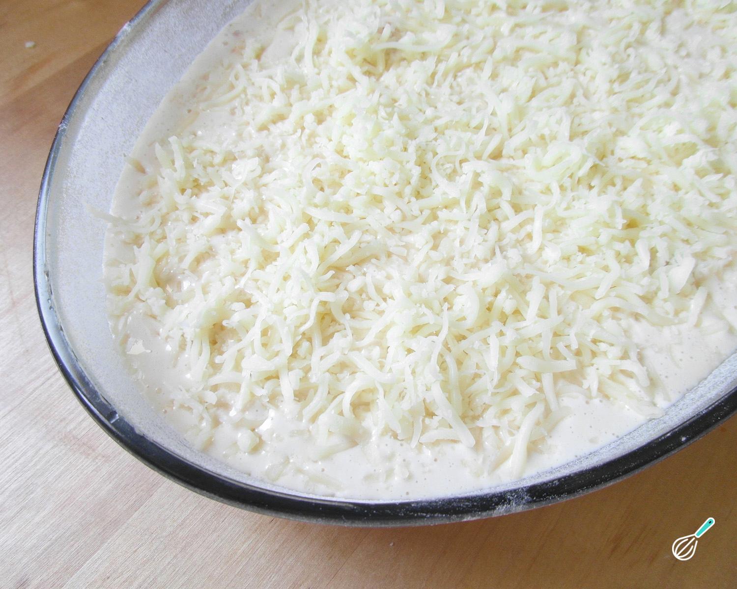 Numa panela grande à parte prepare um molho branco: derreta a restante manteiga com a farinha e misture até virar uma pasta. Pouco a pouco, enquanto mexe, acrescente o leite. Fique mexendo até ferver e engrossar e tempere a gosto com sal e pimenta.