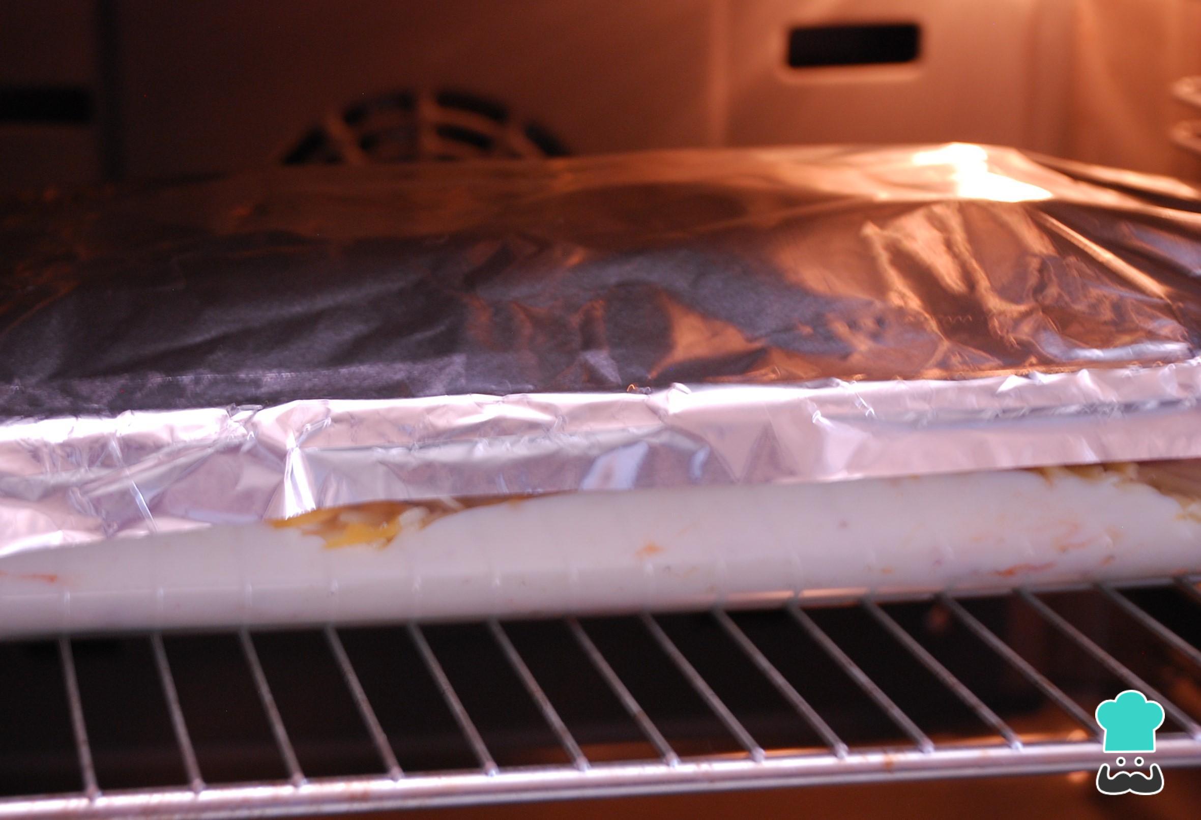 Cubra com papel alumínio e leve ao forno pré-aquecido a 200°C por 30 minutos. Passado esse tempo retire o alumínio e aumente a temperatura, para gratinar o queijo.