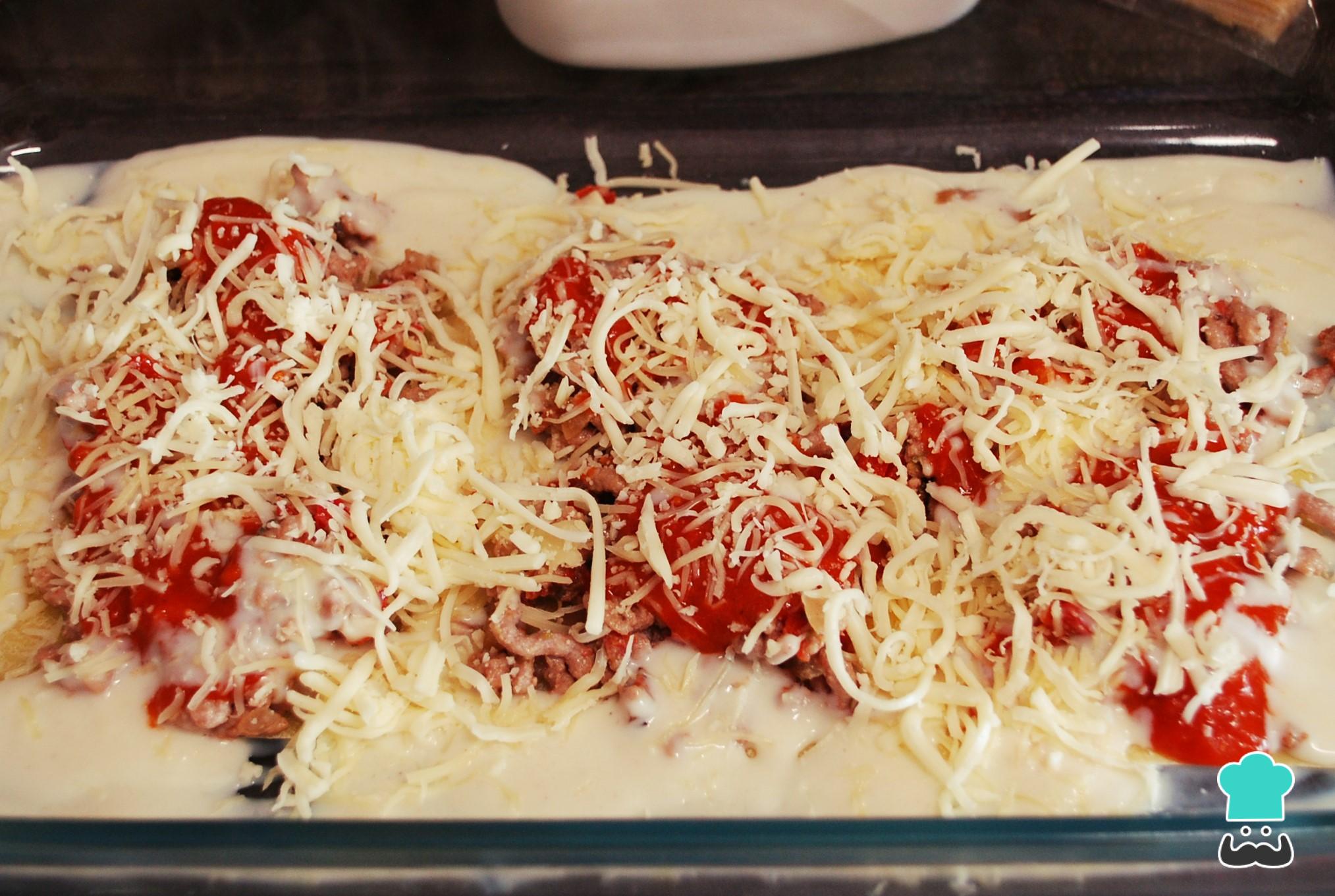 Para montar a lasanha comece por cobrir o fundo com um pouco do molho branco caseiro. Em seguida coloque algumas folhas de lasanha, tentando não sobrepor elas, e acrescente um pouco de carne moída em cada uma.