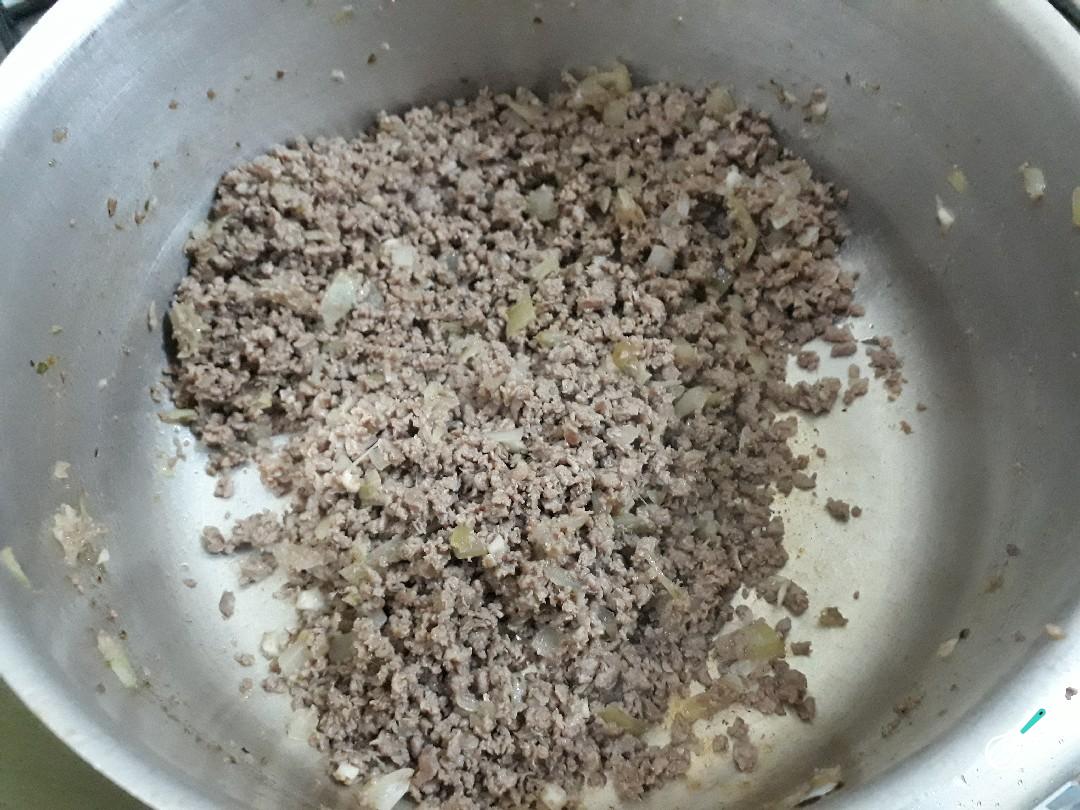 Primeiramente comece por preparar o molho vermelho com carne (molho bolonhesa): refogue a carne moída com o alho e a cebola até ficar soltinha e começar a dourar.