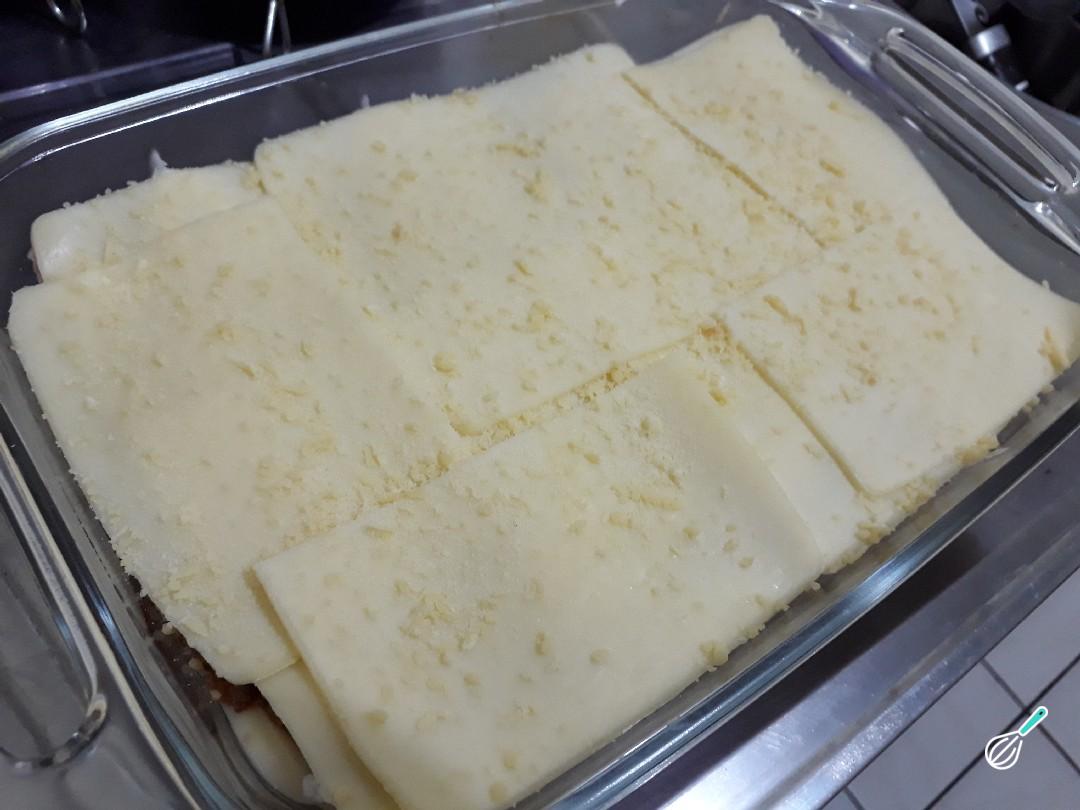 E em seguida a mussarela em fatias, que vai deixar esta lasanha de carne moída simples e rápida bem gostosa!