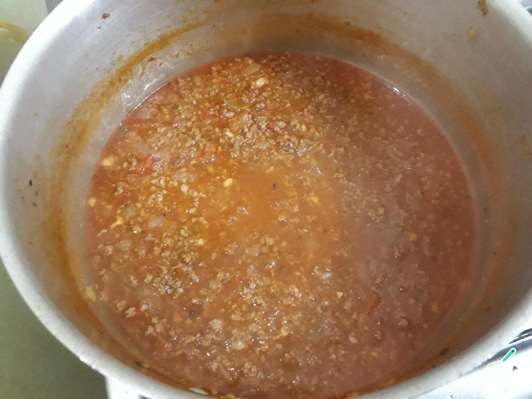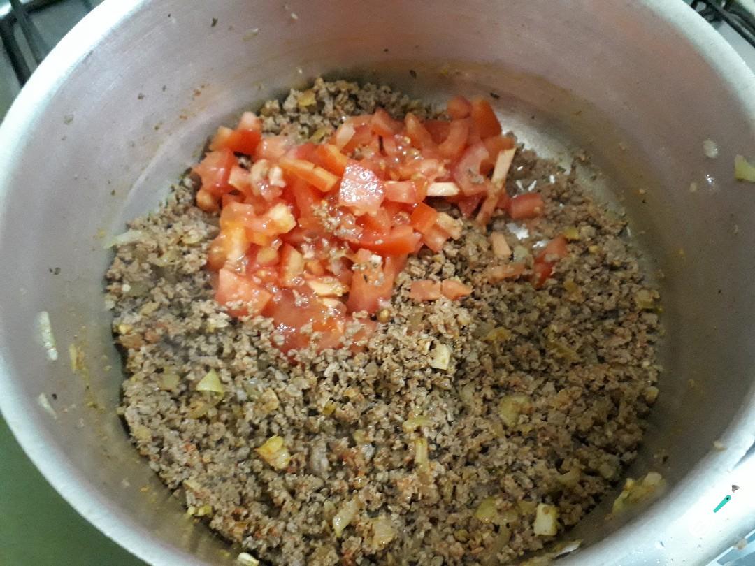 Depois adicione o colorau e o tomate e refogue mais um pouco, até o tomate ficar macio.