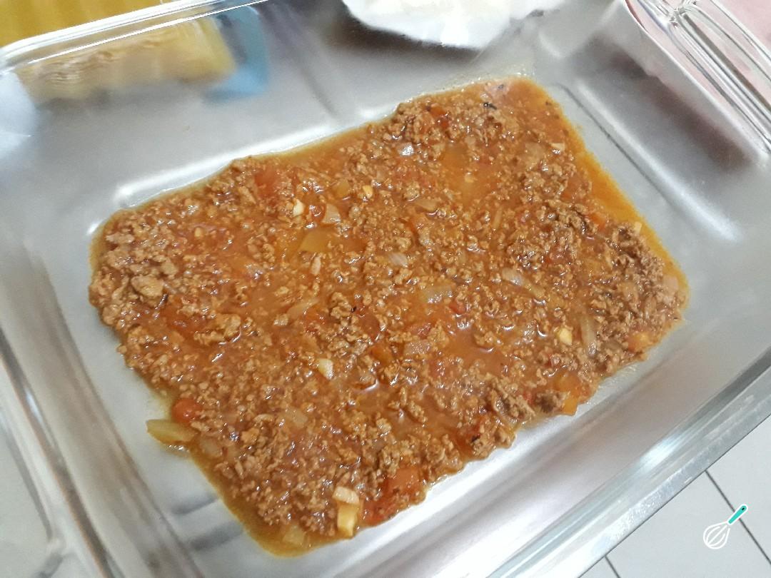 Acrescente mais uma camada de molho bolonhesa sobre a massa.