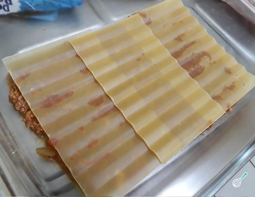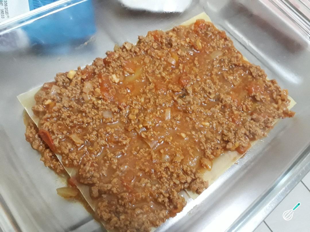 Para montar esta lasanha de carne moída fácil comece colocando uma camada de molho na assadeira (assim você garante que a massa não gruda).
