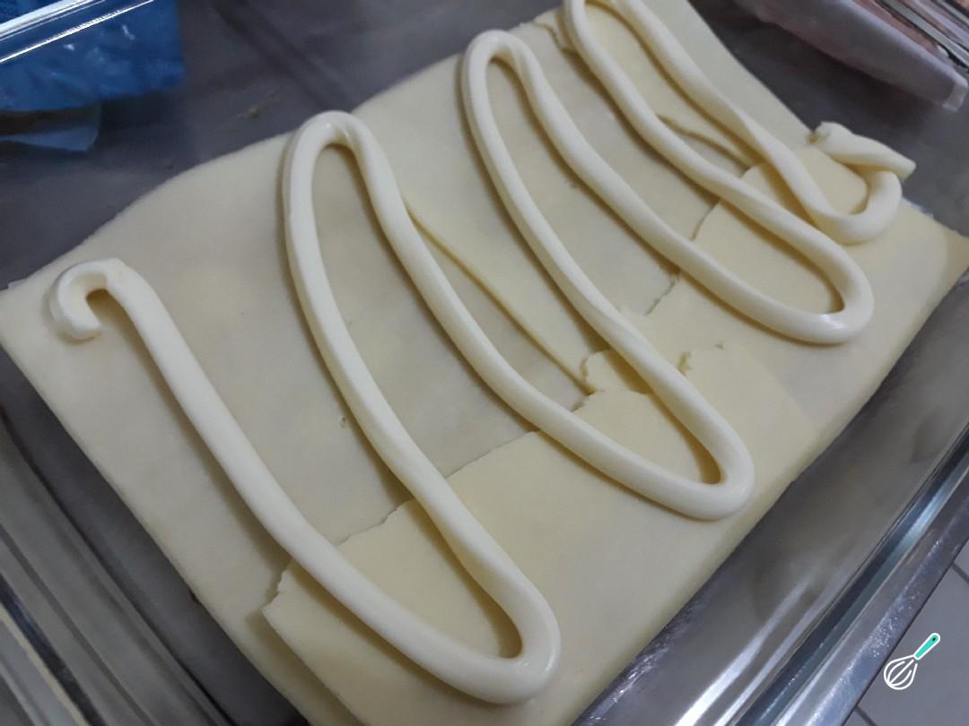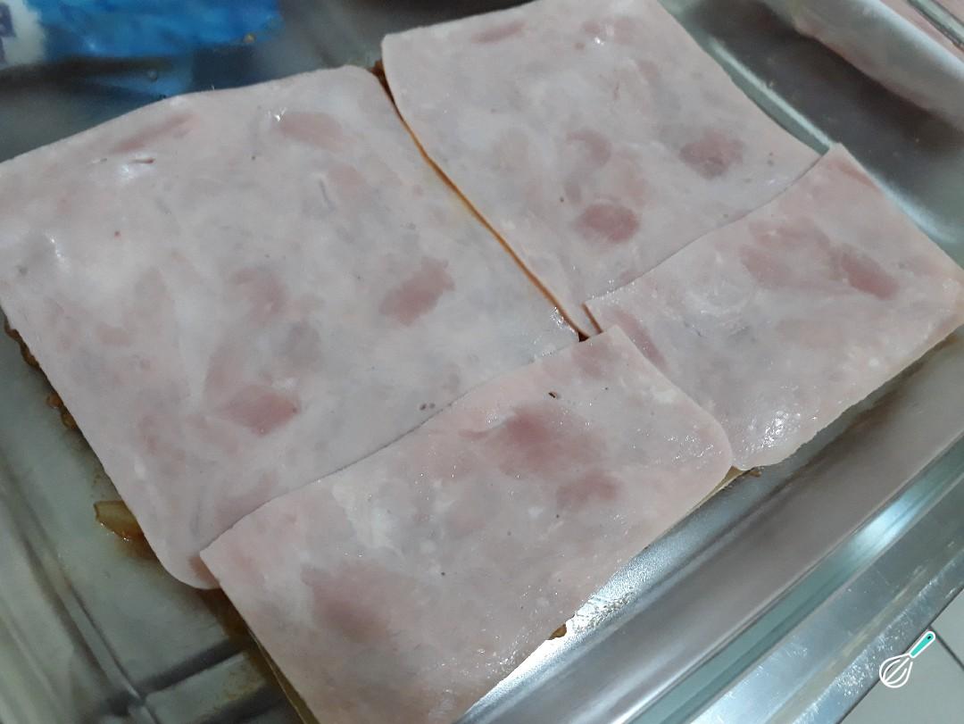 Dica: A ordem das camadas é massa, molho, presunto, mussarela, requeijão, massa, molho, presunto, mussarela, requeijão...