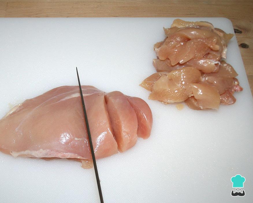 Para fazer o molho de frango pique o peito de frago bem picadinho. Coloque um uma panela um fio de óleo e aqueça, refogue o frango.