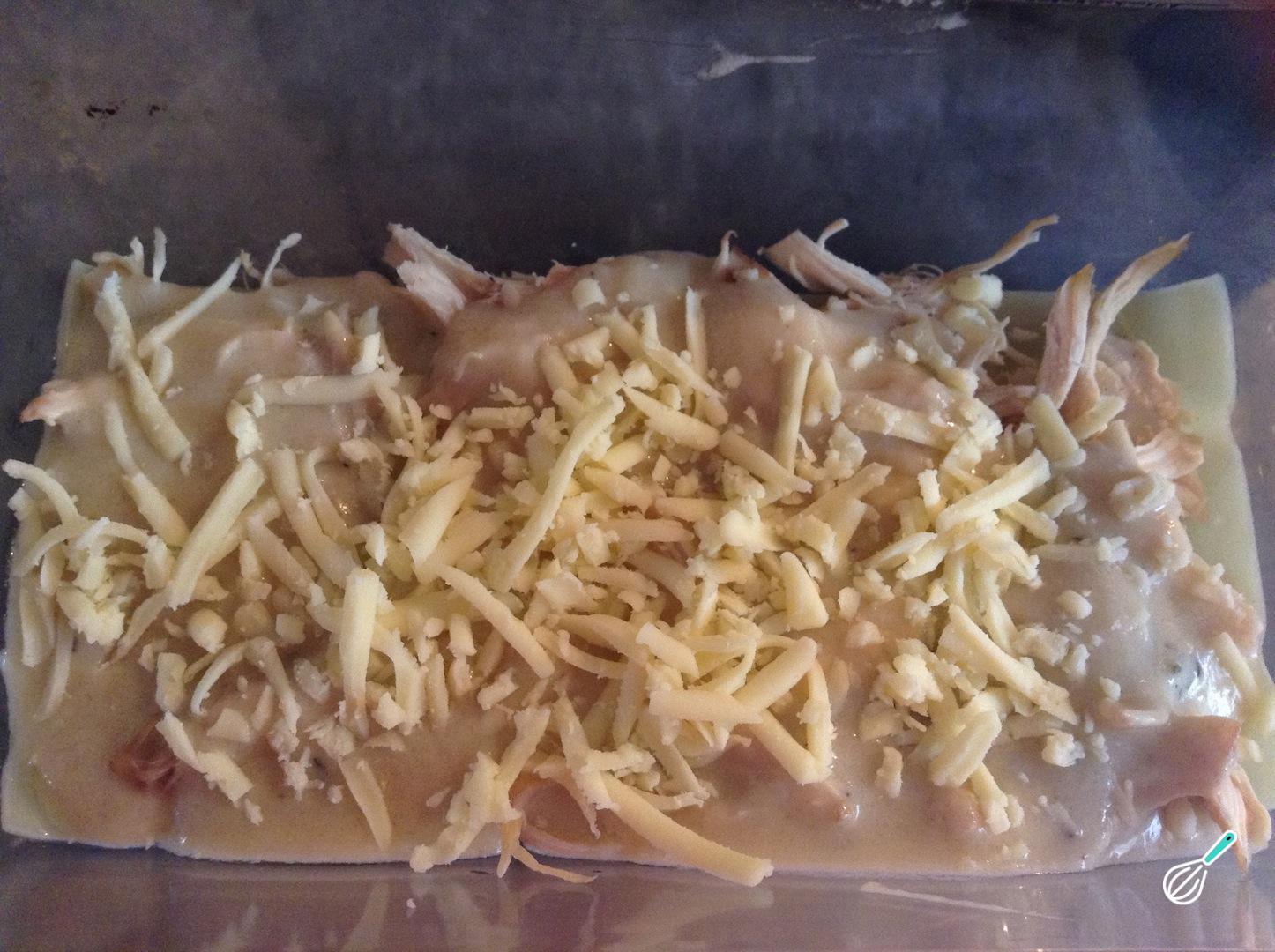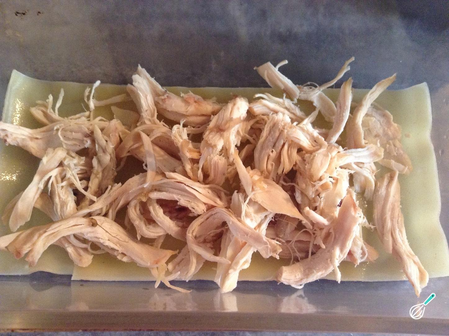 Depois de ter cozido as folhas de lasanha, em um refratário previamente untado adicione uma folha de lasanha e um pouco de frango desfiado sobre ela.