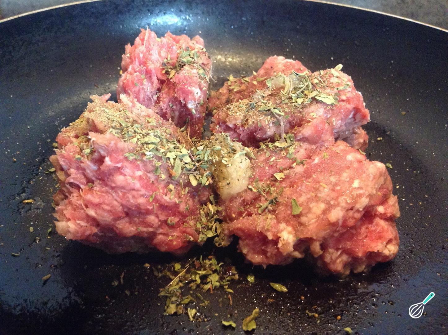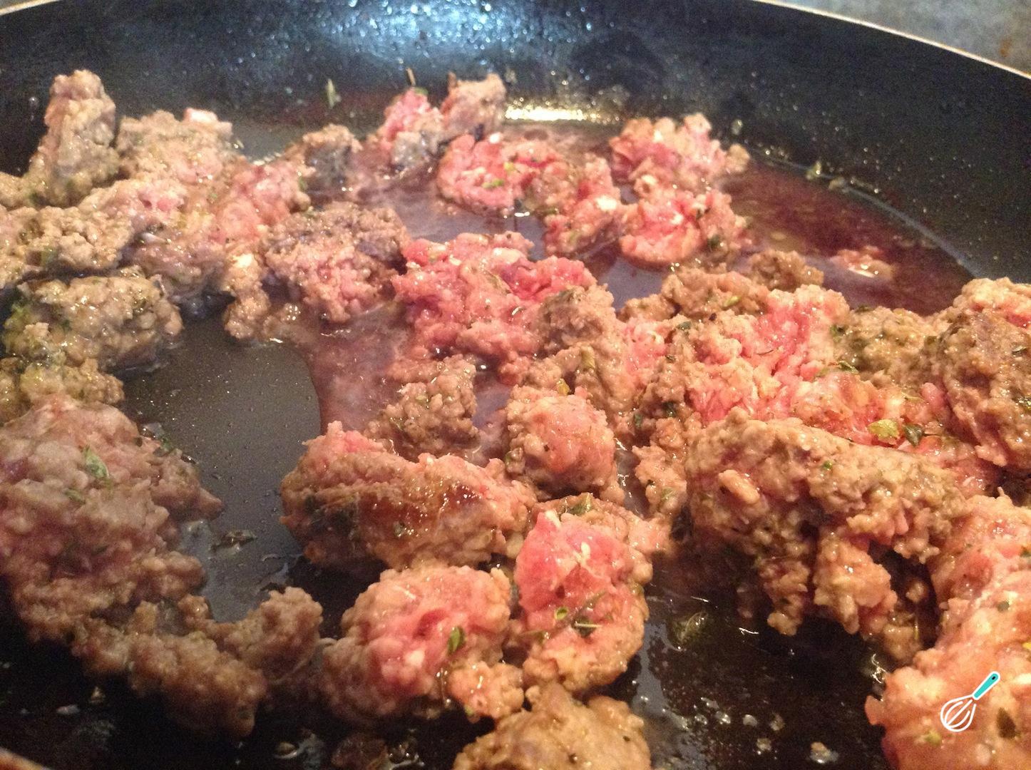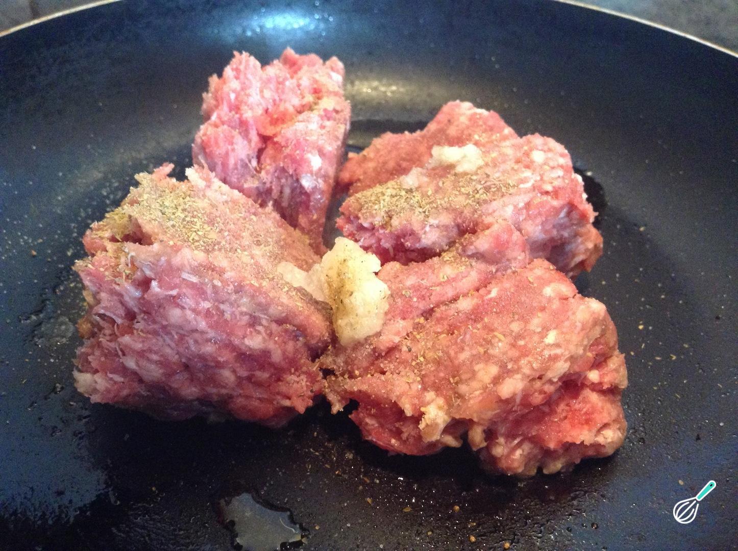 Prepare agora o molho de carne. Para isso, aqueça uma frigideira em fogo médio e adicione uma colher de sopa de óleo de girassol, adicione a carne moída com sal, pimenta do reino e pasta de alho a gosto.