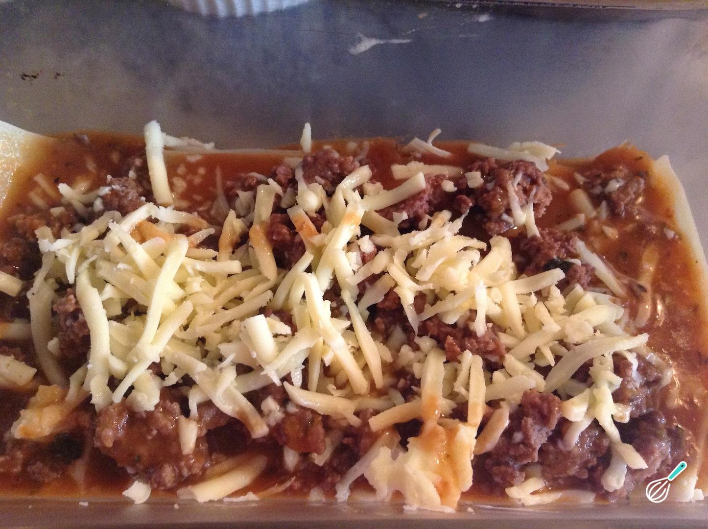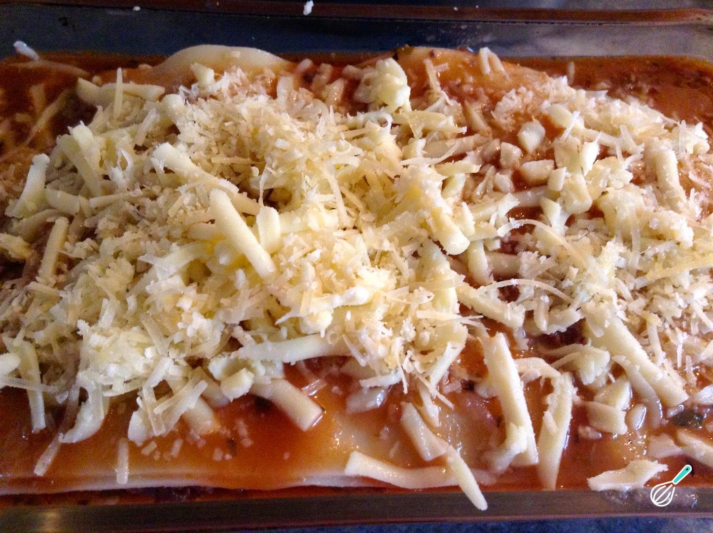 Assim que o molho de carne fique pronto, cubra a primeira camada com uma folha de lasanha cozida e adicione o molho de carne que acabou de fazer. Adicione novamente os queijos parmesão e mussarela.