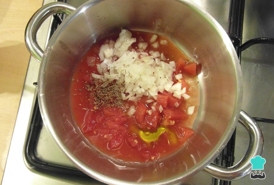 Prepare agora o molho de tomate: em uma panela coloque todos os tomates da lata cortados em pedaços e metade do caldo. Junte o azeite, a cebola picada e os oréganos e leve a cozinhar em fogo médio durante 10 a 15 minutos, mexendo de vez em quando. No final tempere com um pouco de sal e reserve.