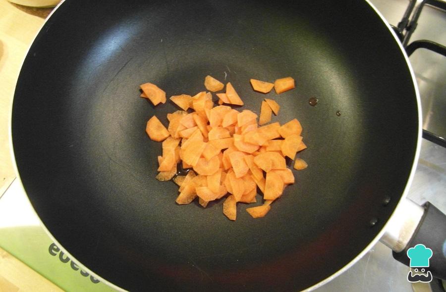 Cozinhe agora os legumes da lasanha de legumes light. Para isso corte todos em pedaços (com exceção dos espinafres) e leve as cenouras ao fogo médio em uma frigideira antiaderente (de preferência wok) com um 1 colher de chá de azeite.