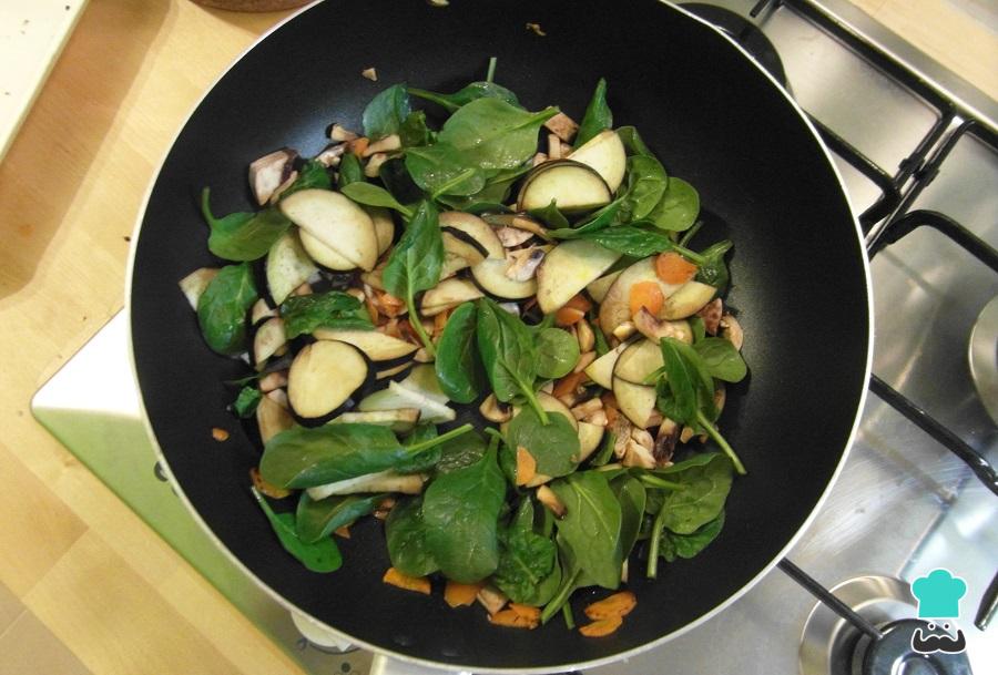 Quando a cenoura estiver mole e dourada, acrescente os restantes legumes. Salteie em fogo médio até que a berinjela murche. Tempere com um pouco de sal.