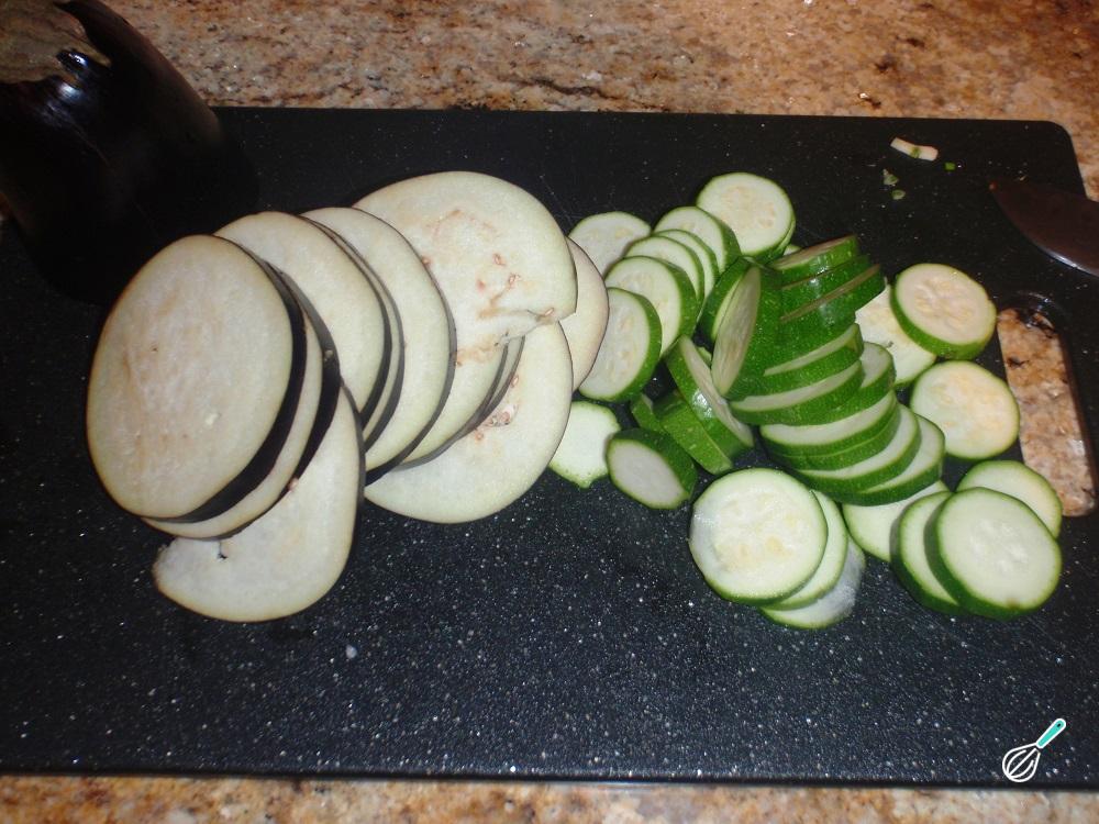 O primeiro passo para preparar esta lasanha de legumes simples é lavar e cortar os legumes em fatias com meio centímetro de espessura aproximadamente.