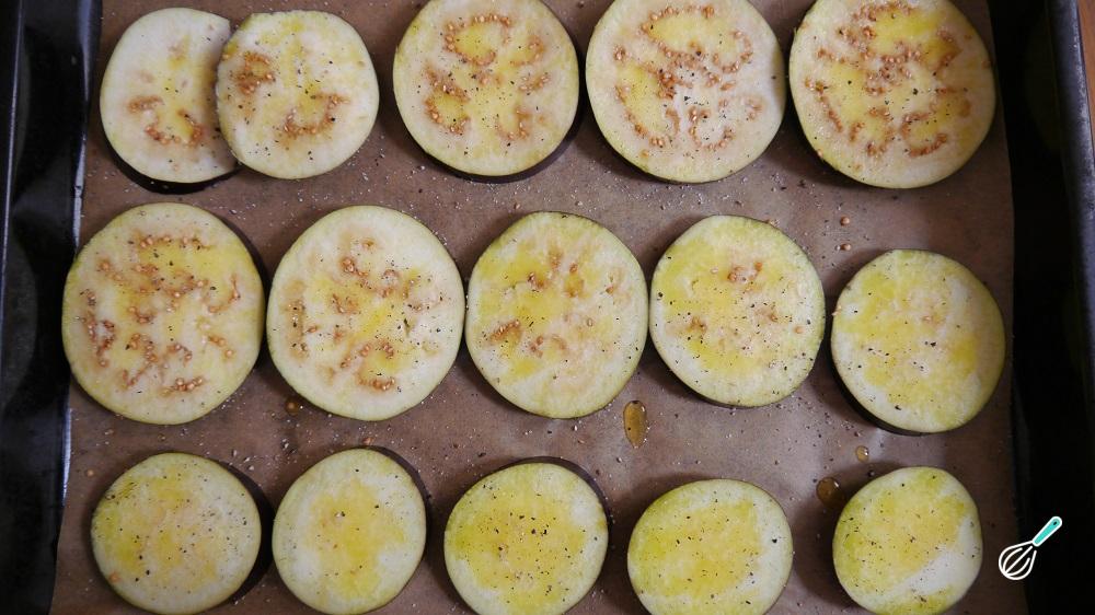Em uma bandeja, coloque as fatias de legumes e tempere com azeite de oliva e sal. Coloque o tabuleiro no forno e asse por 25 minutos a 225 ° C.