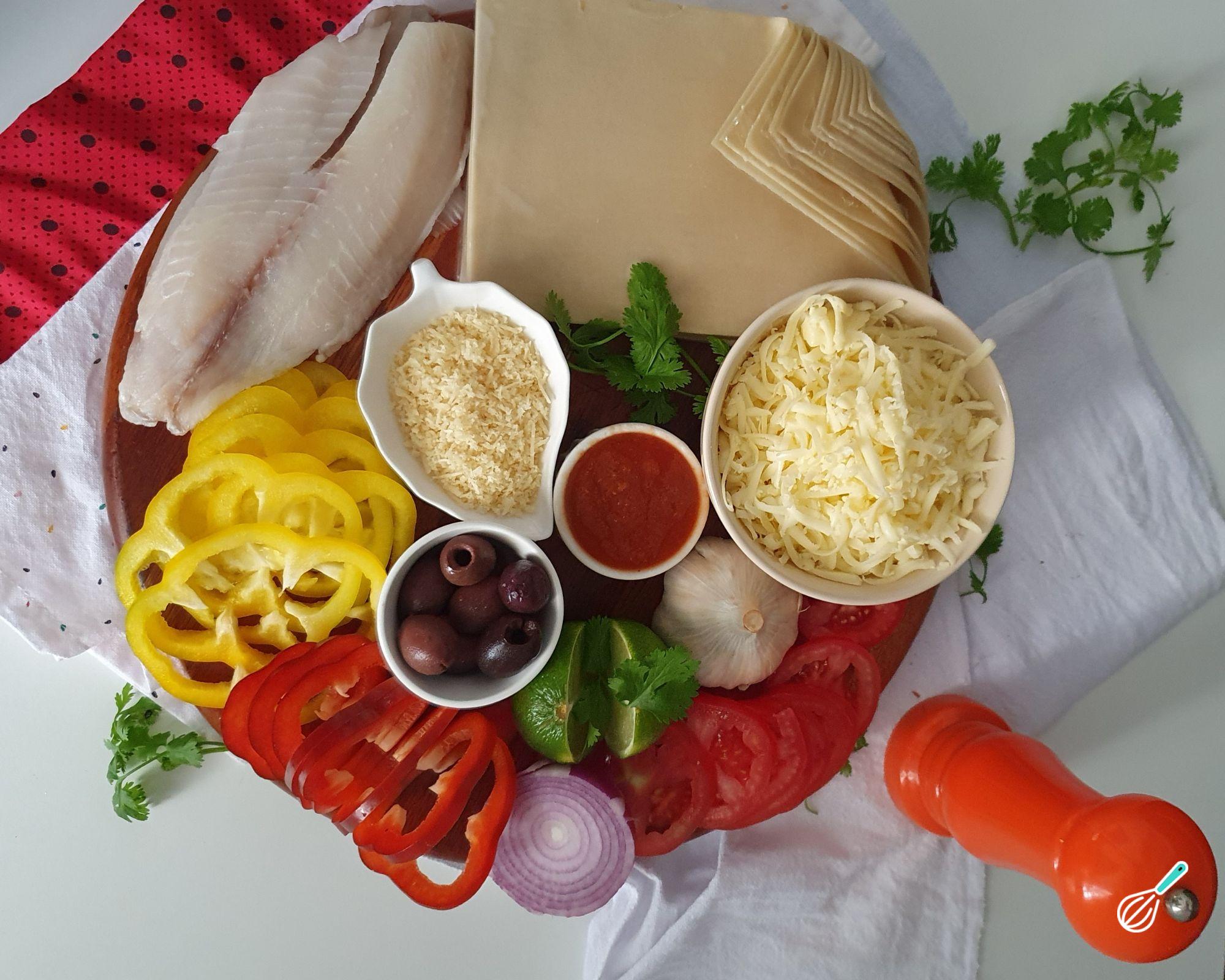 Separe os ingredientes que você vai precisar para fazer a sua lasanha de peixe: filé de peixe, o tomate, a cebola, os pimentões, os alhos, a azeitona, coentro, pimenta do reino, queijo parmesão ralado , molho de tomate, sal, limão e a massa da lasanha.