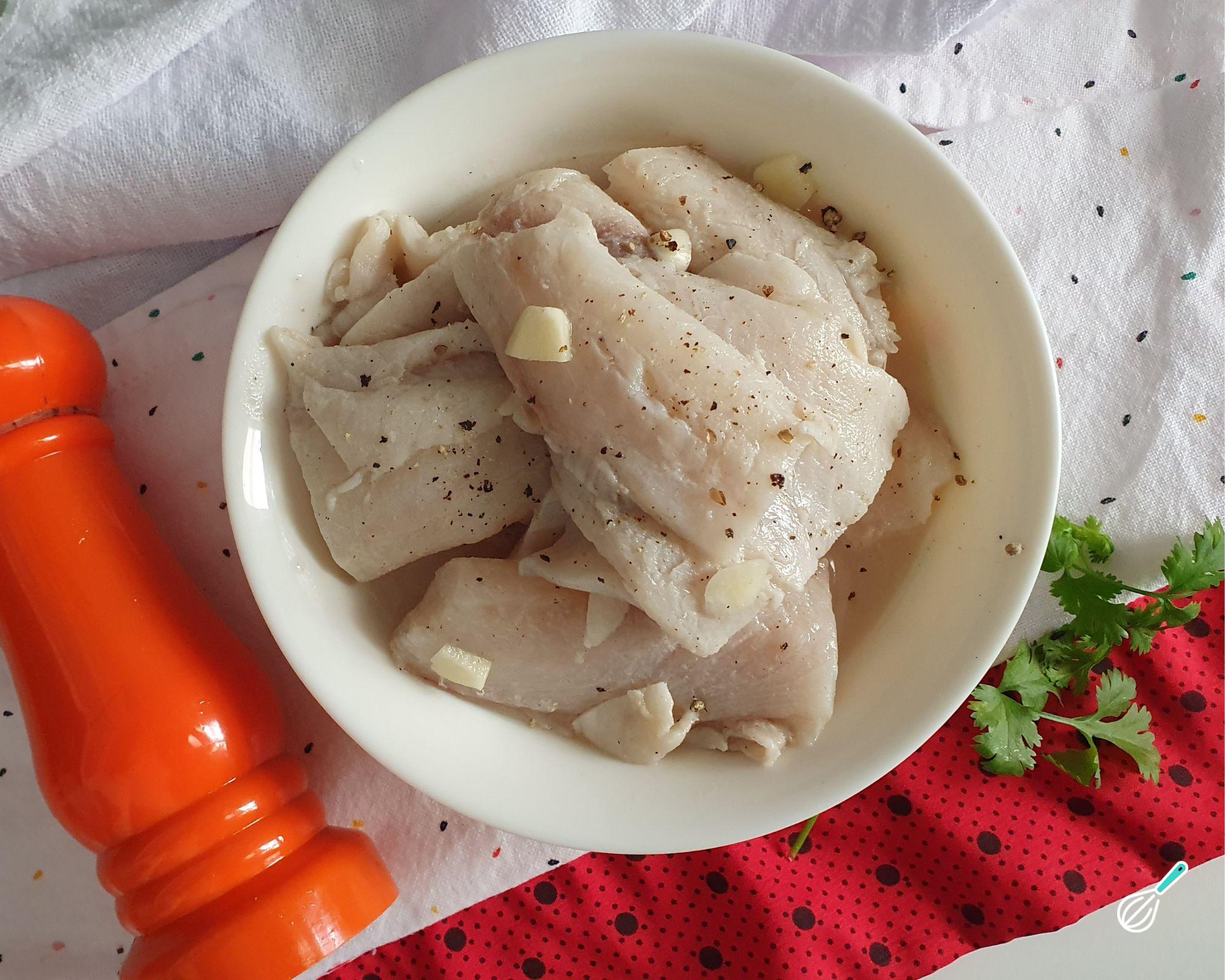 Comece por temperar o peixe com limão, sal, 2 dentes de alho e pimenta do reino.