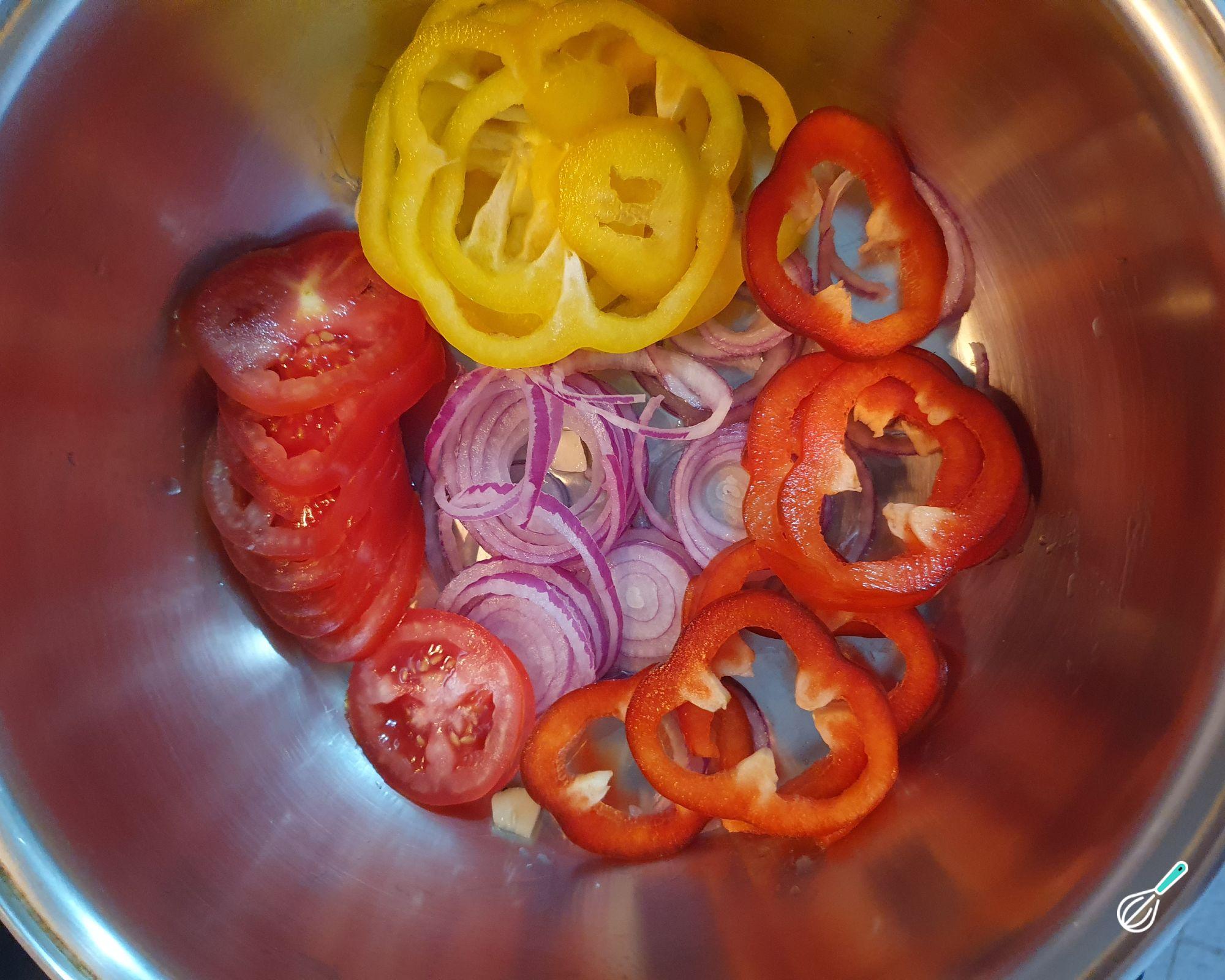 Coloque para refogar o alho, a cebola, os pimentões e o tomate.