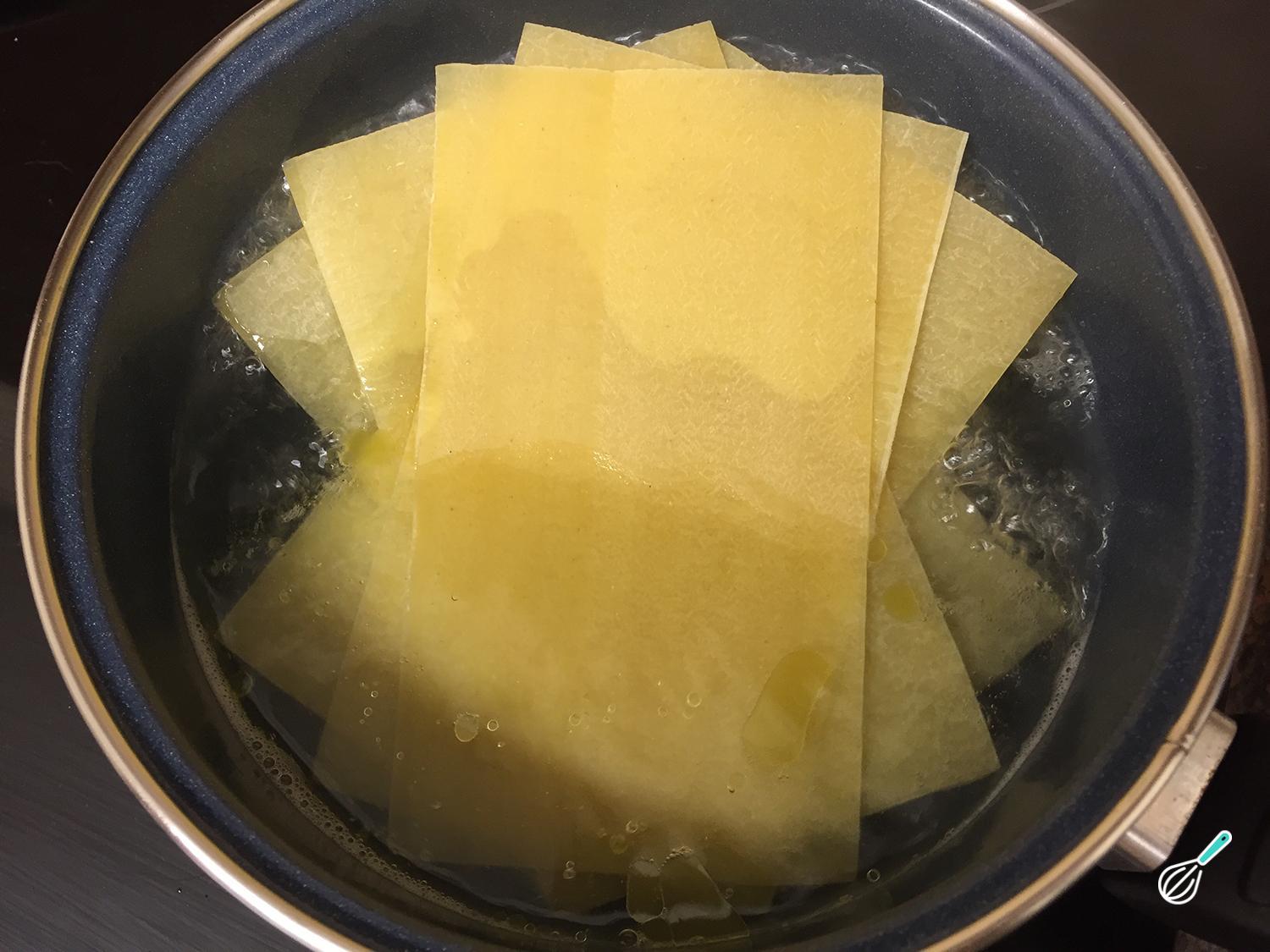 Para começar a preparar a lasanha de presunto e queijo para crianças, comece por conferir as instruções do pacote das folhas de massa para cozinhá-las como indicado. No meu caso, eu tive que fervê-las por 10 minutos.