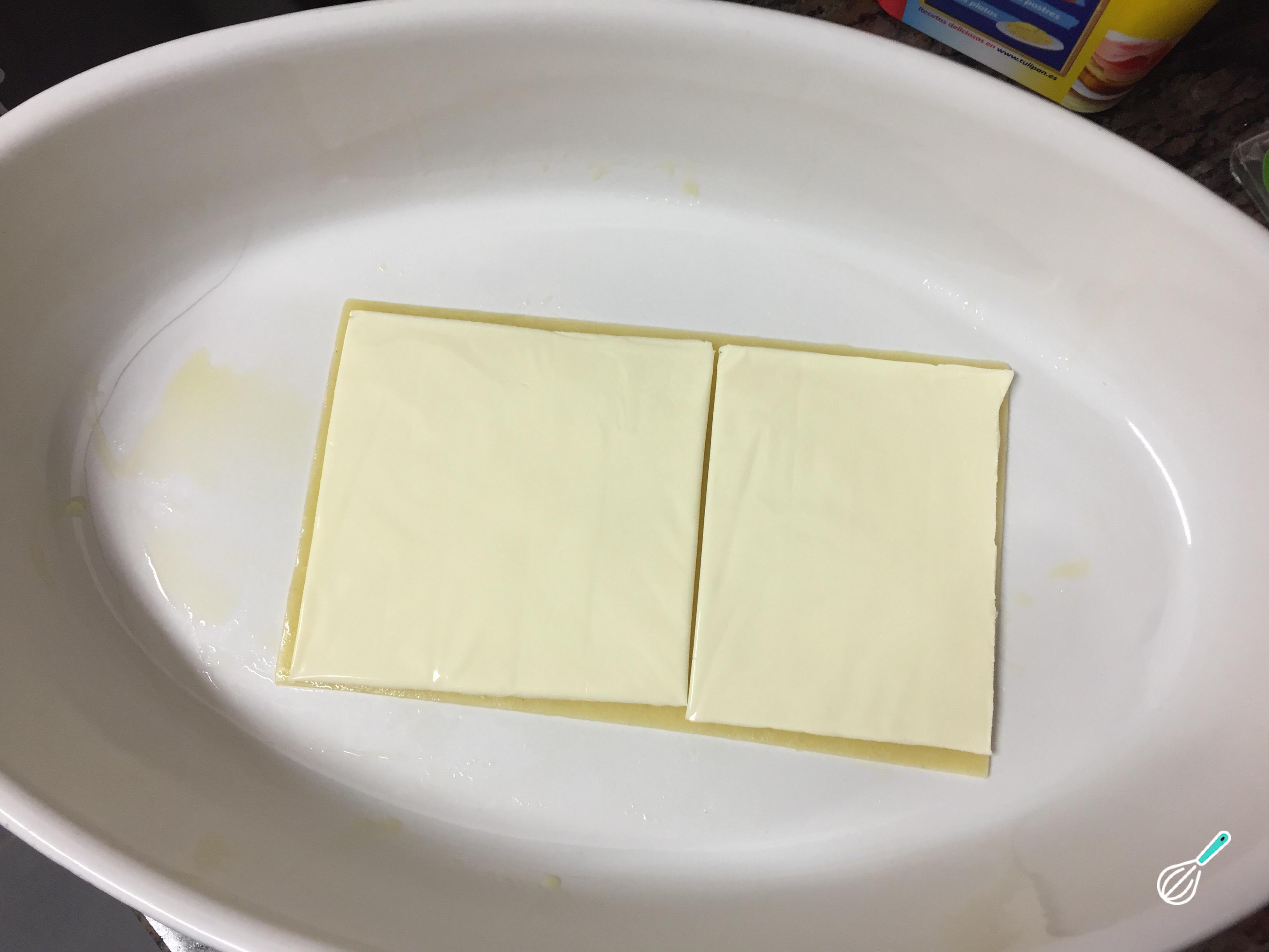Dica: Aqui você tem várias opções, você pode colocar duas fatias de queijo, como fiz para cobrir toda a folha de massa, ou uma único, tudo vai depender do tamanho da massa.