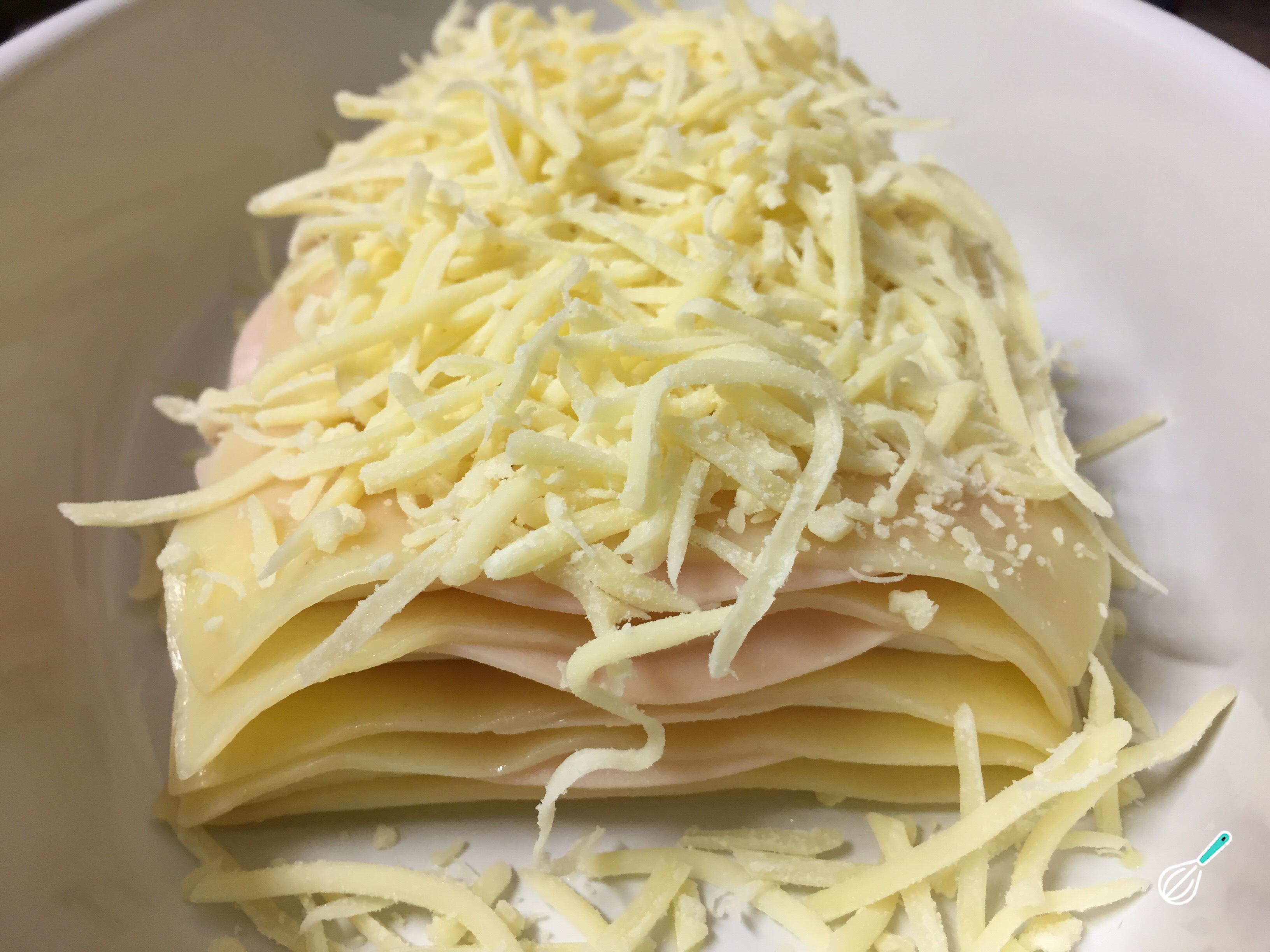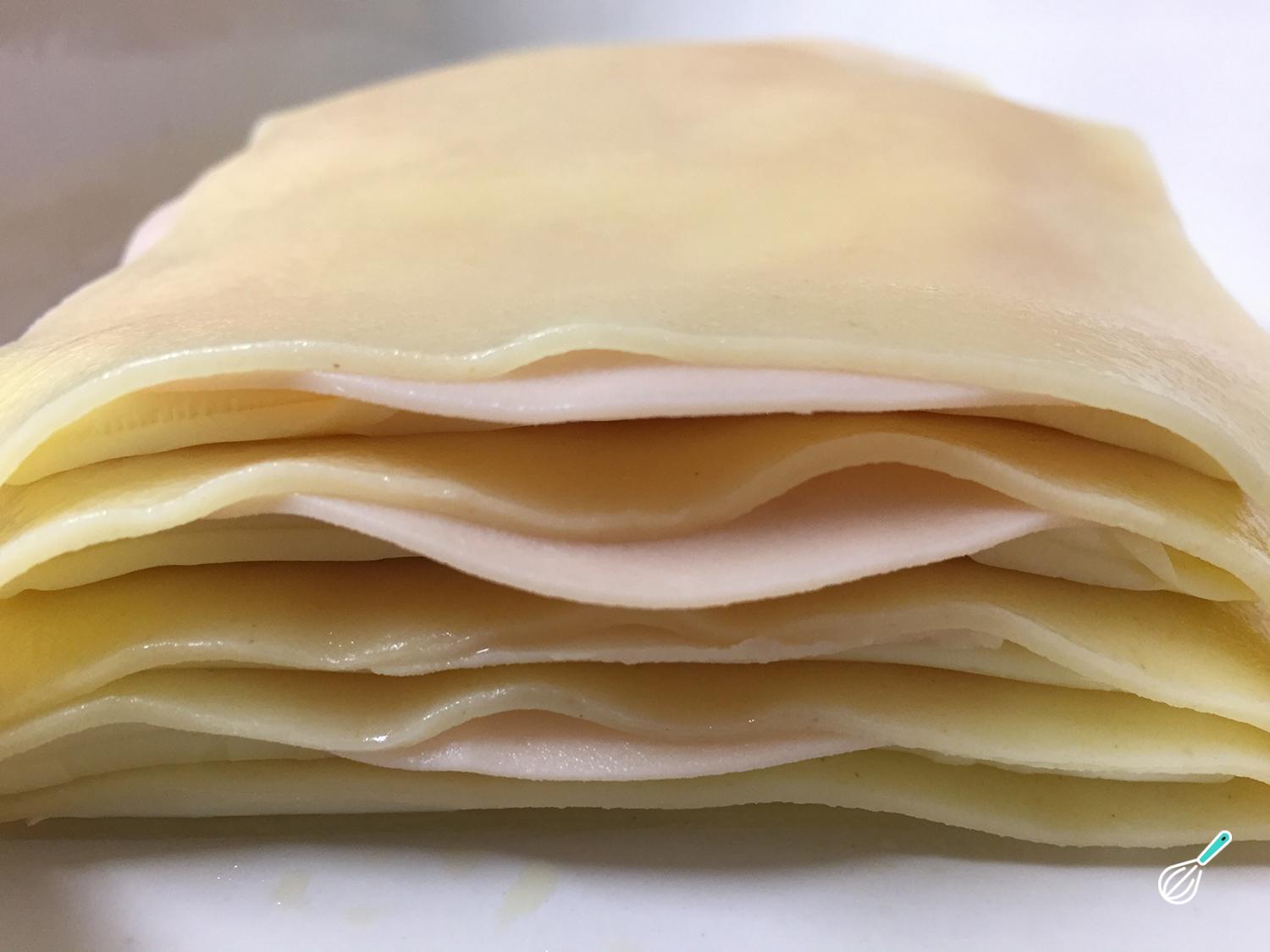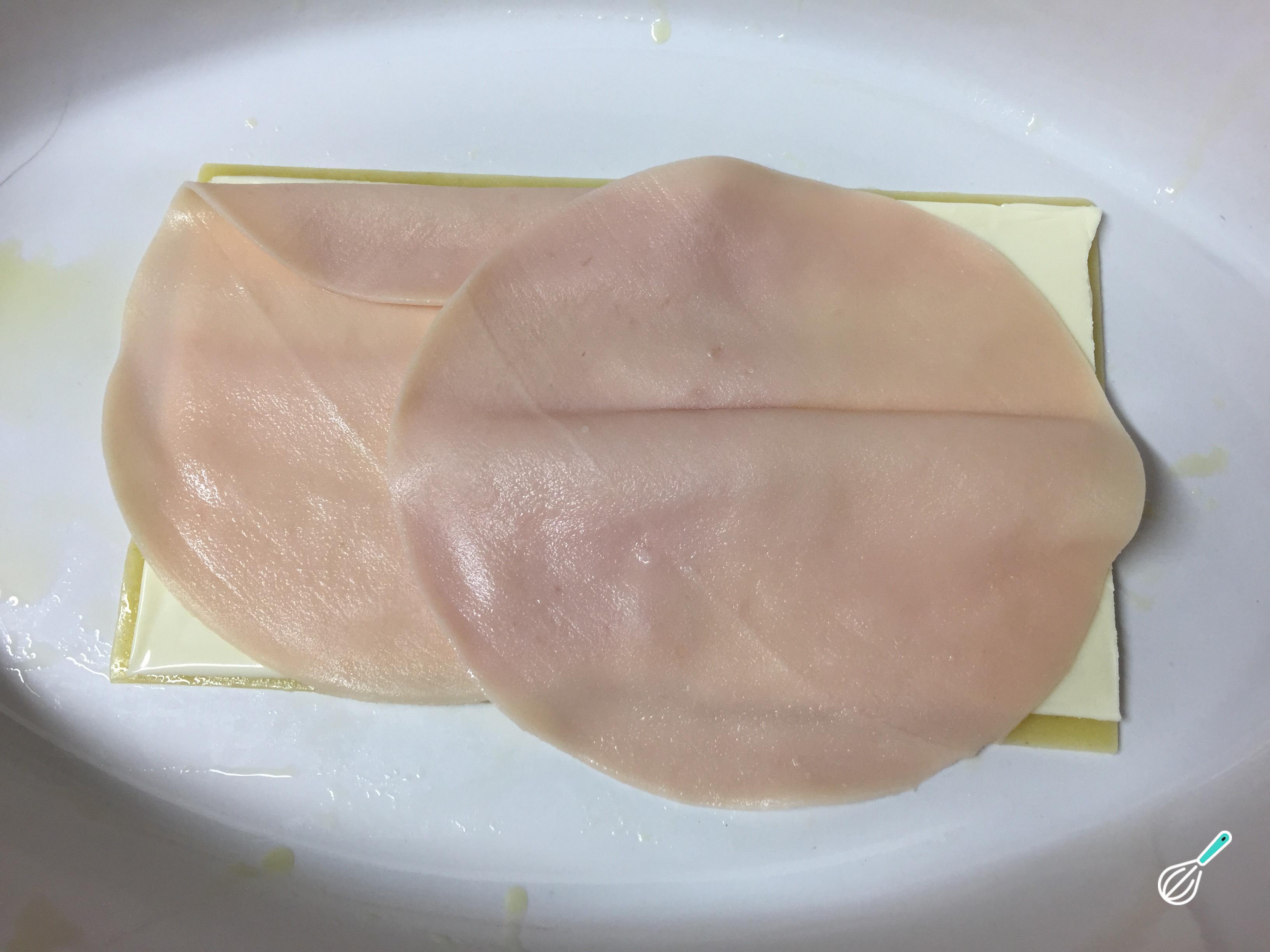 Sobre o queijo, coloque o presunto cozido como no passo acima. Do mesmo jeito, pode colocar uma ou duas fatias de presunto, dependendo do tamanho das fatias e da folha de lasanha.