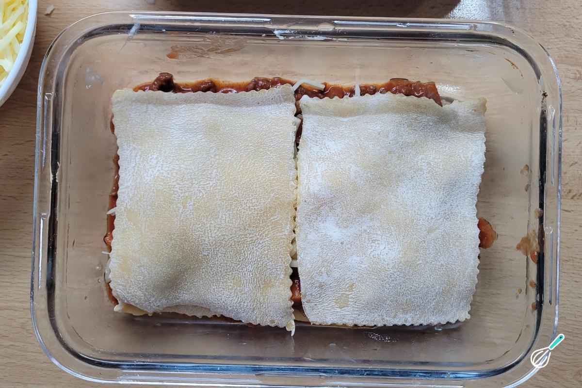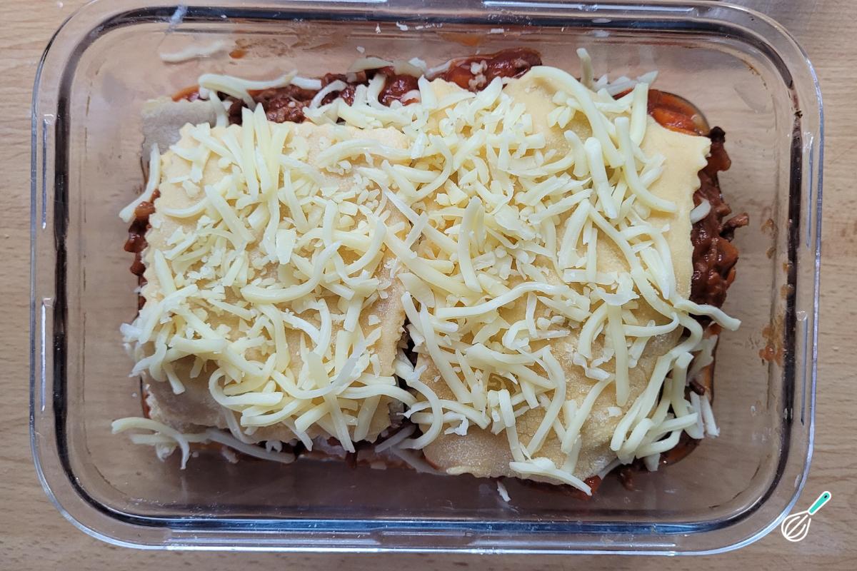 Cubra com as folhas de massa de lasanha, faça mais uma camada de recheio e cubra com queijo ralado a gosto.