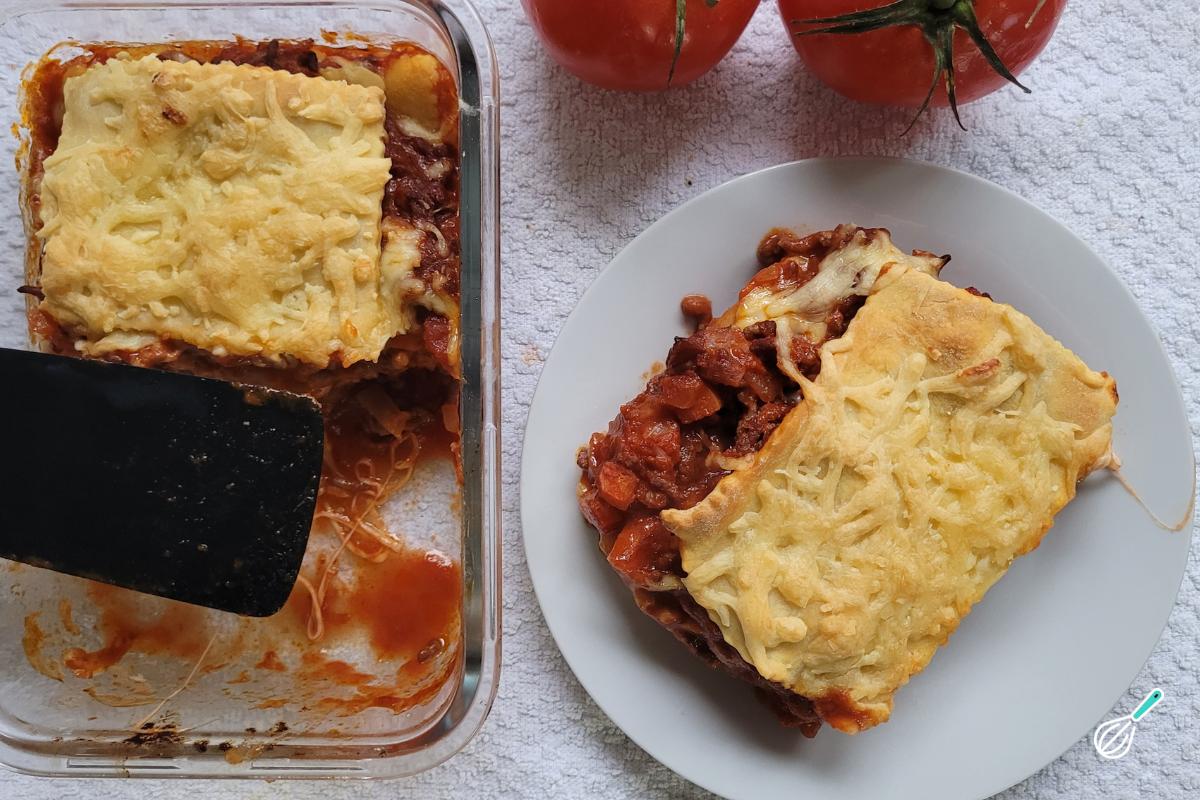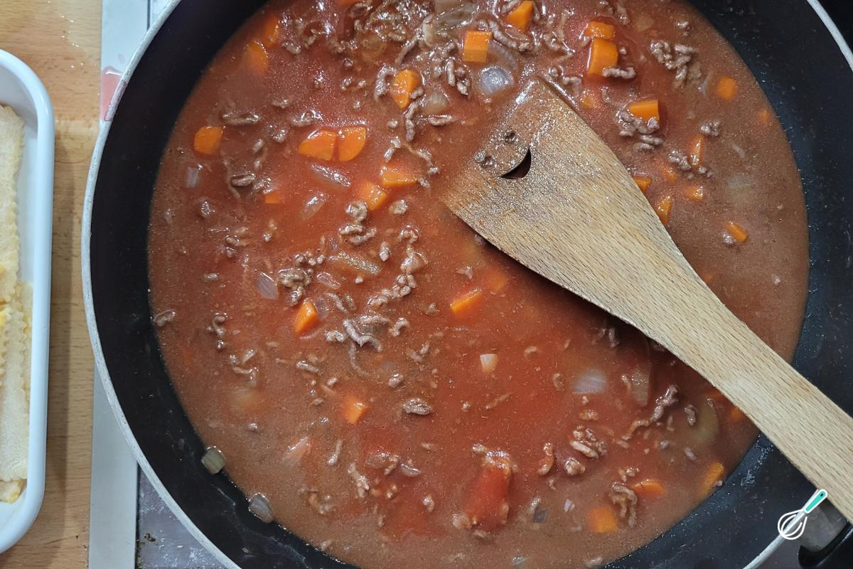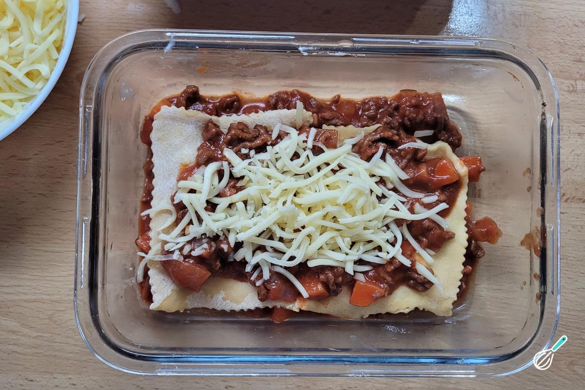 Além disso, ela também pode ser congelada. Então você pode fazer em um recipiente maior que caiba na air fyer, mas que renda mais porções para guardar mais para depois. Aqui fizemos uma versão clássica com molho bolonhesa à base de carne moída, mas você pode usar o recheio que quiser.