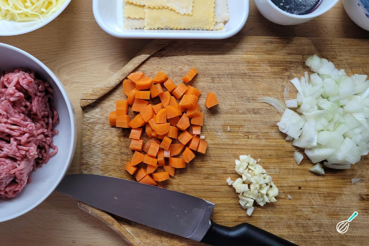 Corte a cebola, o alho e a cenoura em cubinhos pequenos.