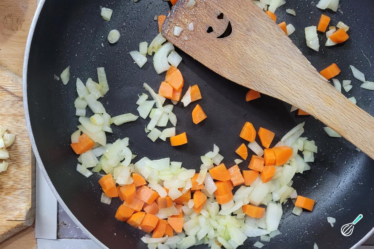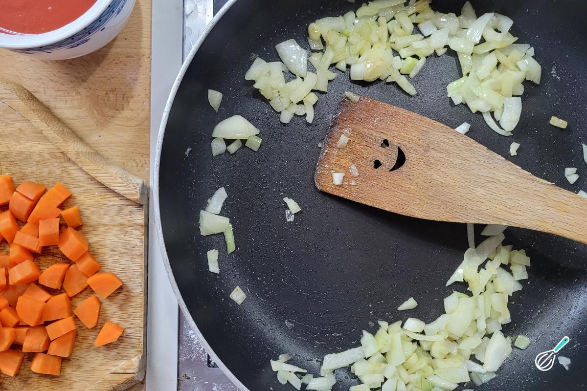 Quando estiver translúcida, adicione a cenoura e deixe refogar um pouco.