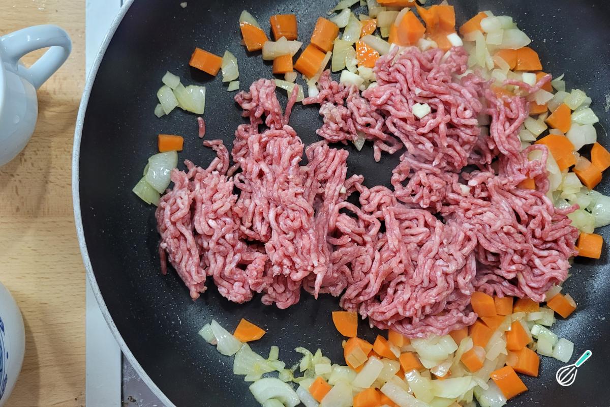 Adicione a carne moída. Tempere com sal e pimenta do reino e deixe refogar.