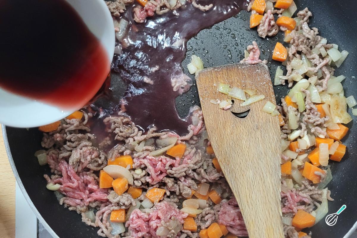 Adicione o vinho tinto e deixe em fogo alto até o vinho evaporar.