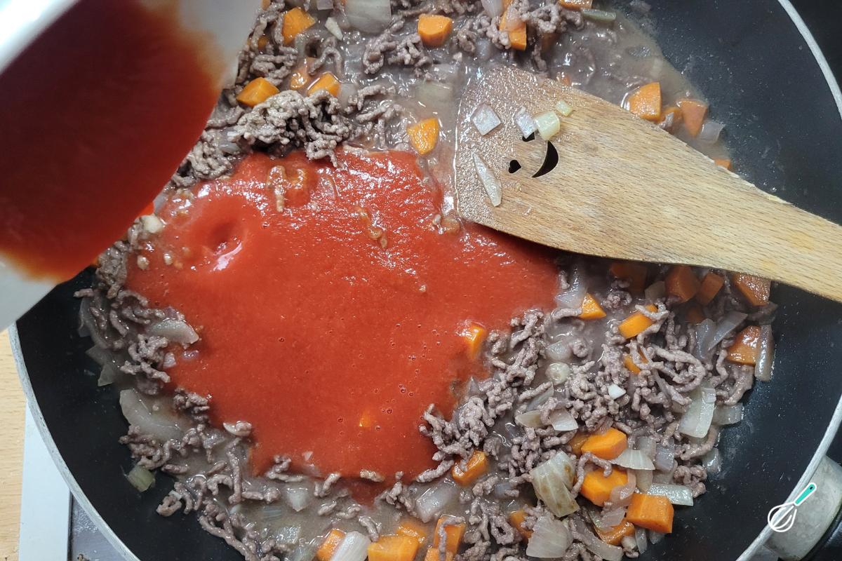 Quando o vinho evaporar, adicione a passata de tomate. Se necessário, adicione um pouco de água.
