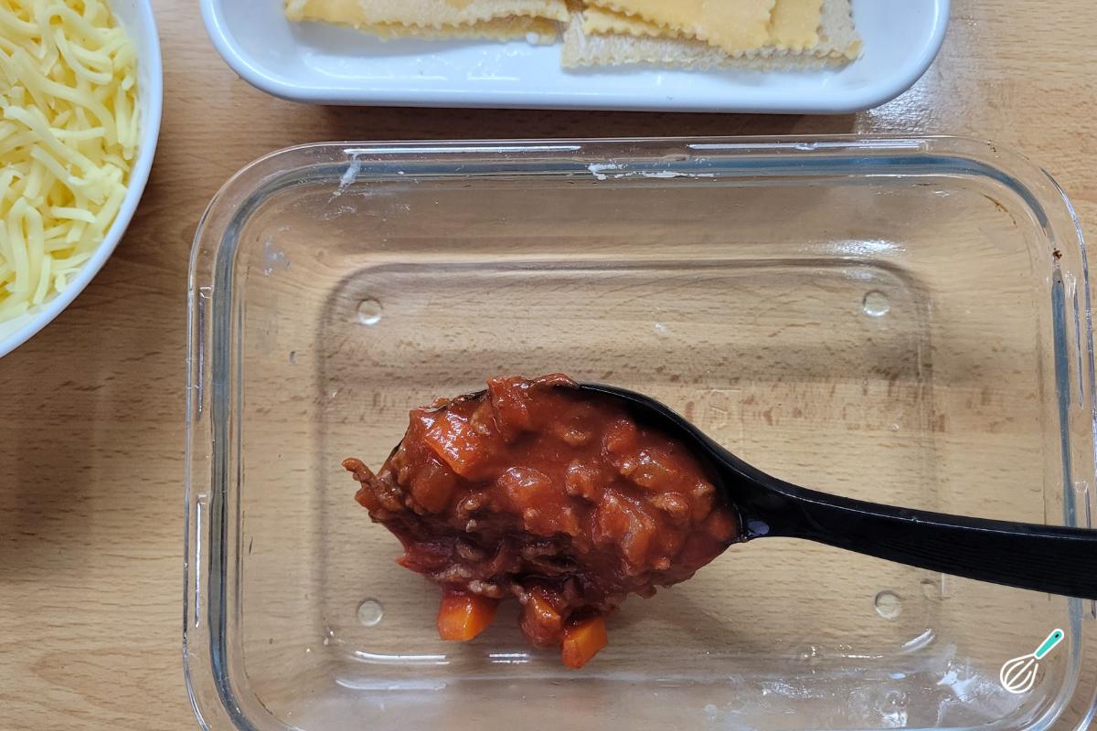 Faça uma camada de molho bolonhesa no fundo de um refratário que caiba na air fryer.