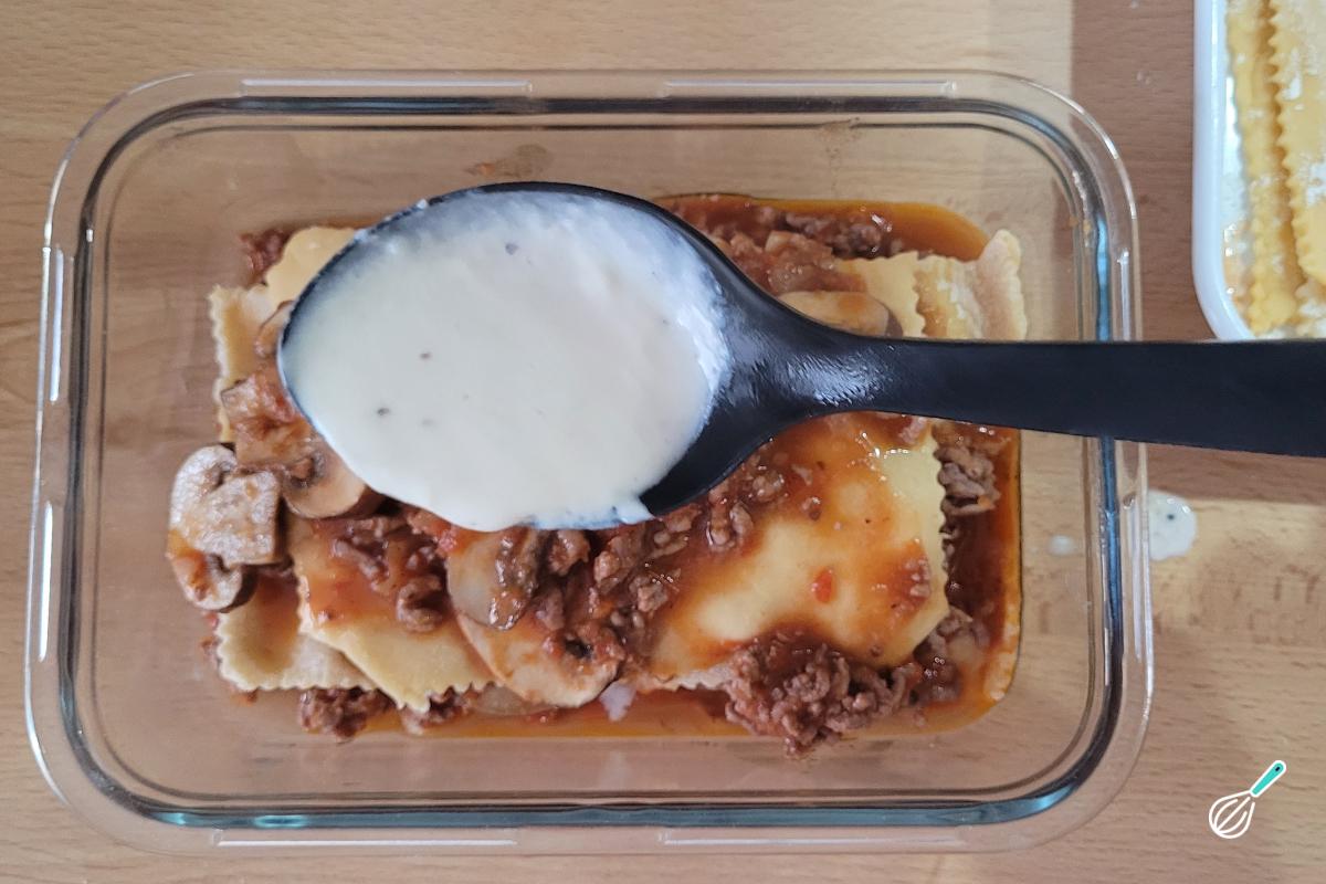 Cubra a última folha com molho branco, que vai ajudar a gratinar e garantir que a lasanha fique úmida na air fryer.