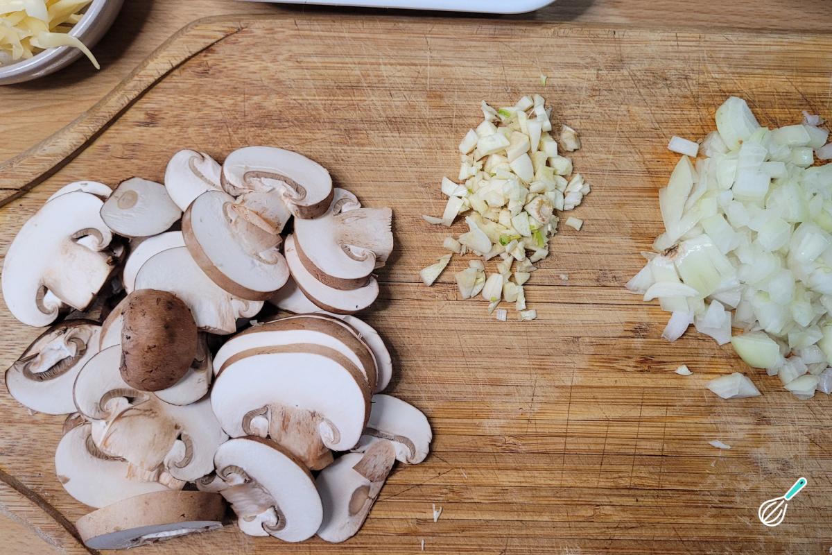 Corte a cebola e o alho em cubinhos e os cogumelos em fatias.