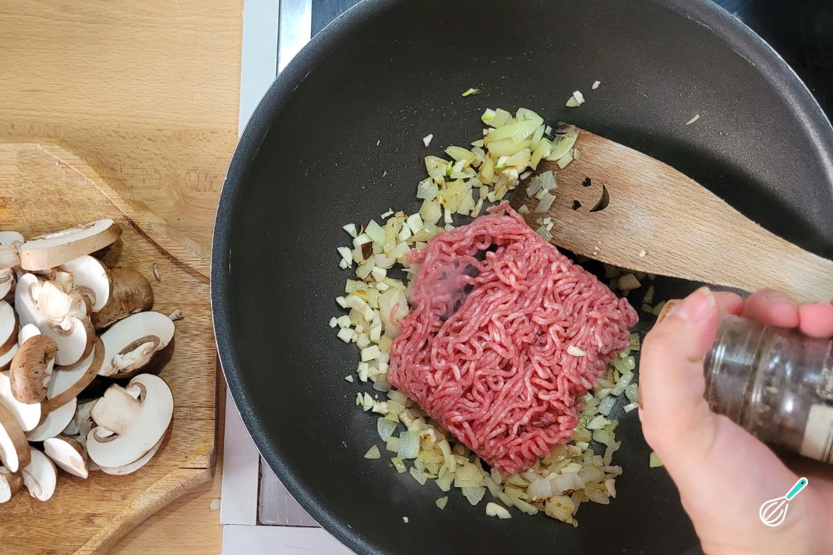Adicione a carne moída, tempere com sal e pimenta do reino e vá separando com uma espátula, mexendo até separar. Deixe até que a carne esteja bem dourada.