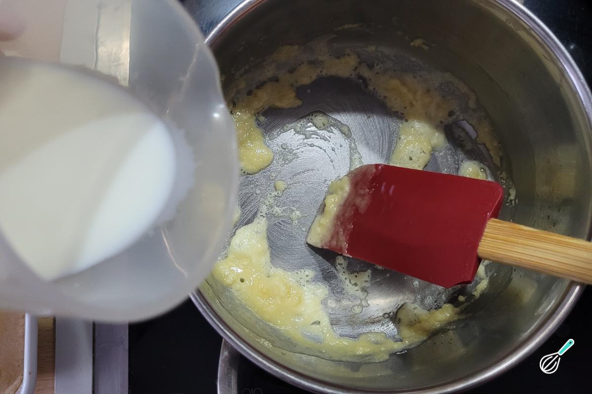 Adicione o leite aos poucos sempre mexendo para não empelotar. Se preferir, use um batedor de arame.