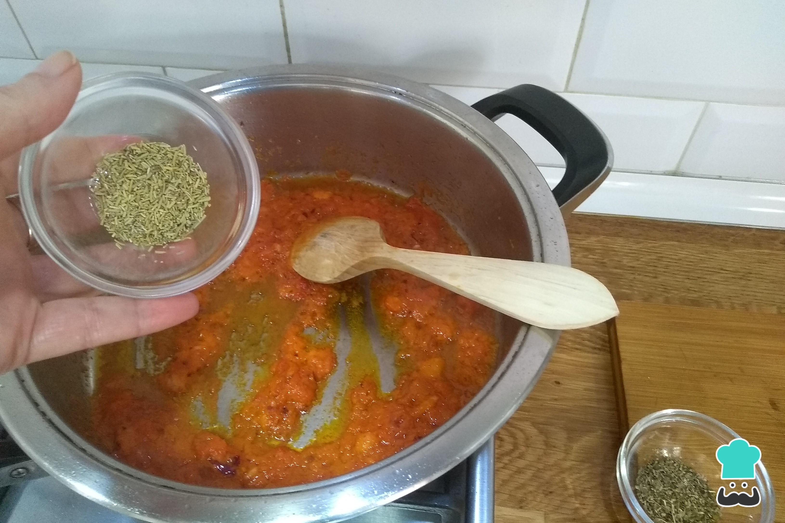 Em seguida adicione as ervas aromáticas (alecrim e orégano), para aromatizar este refogado para a lasanha. Deixe cozinhar por mais 1-2 minutos, no fogo baixo, e adicione a carne moída.