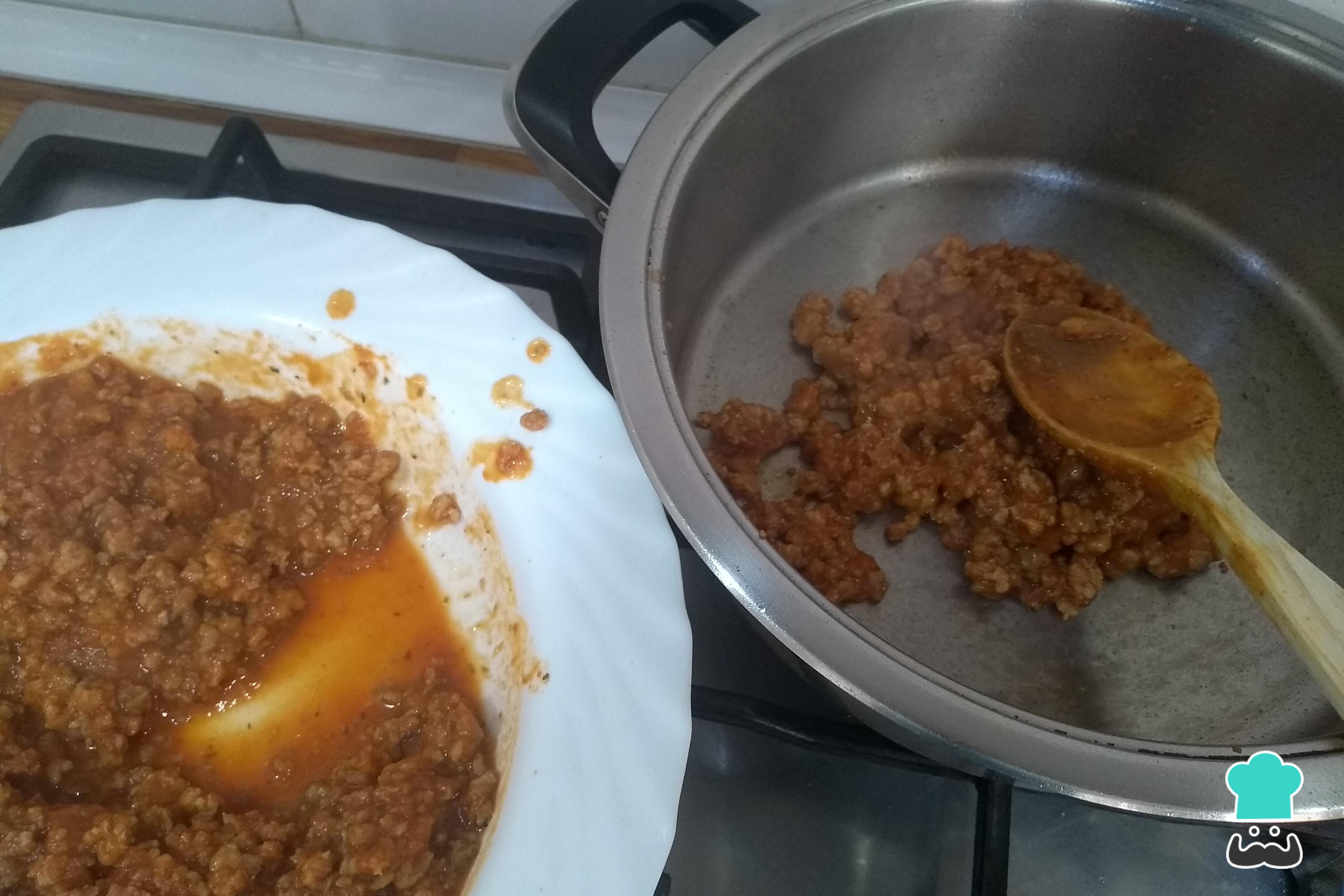 Cozinhe a carne moída por aproximadamente 5 minutos, mexendo de vez em quando, para soltar todos os pedacinhos. Depois adicione o vinho e continue mexendo por mais 1 minuto. Por fim coloque a polpa de tomate, acerte o sal e deixe cozinhar por mais 5 minutos. Transfira para um prato e reserve.